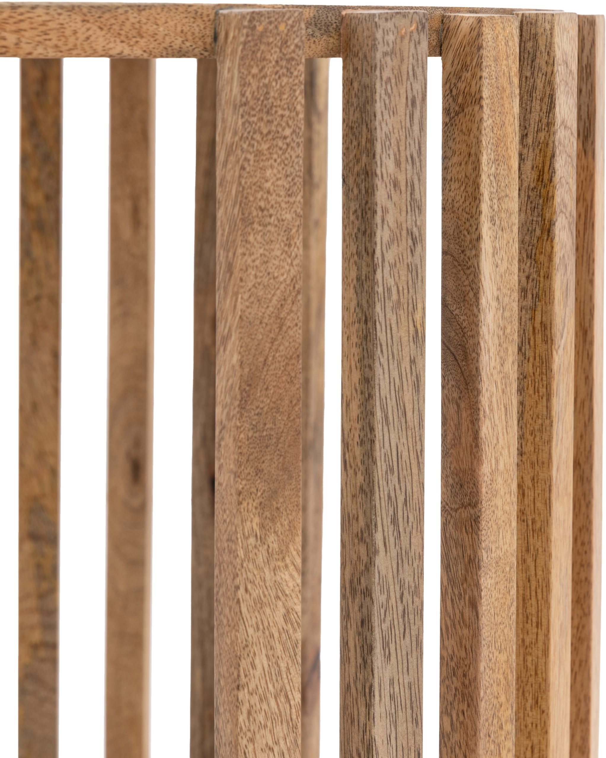 Made with acacia wood in a natural finish to really show off the deep rich grains of the wood, this side table is an eye catching addition to any room. With a vertical slatted design and a lower shelf handy for storage, this side table will fit right in with both modern and vintage inspired interiors. Coordinating items also available.