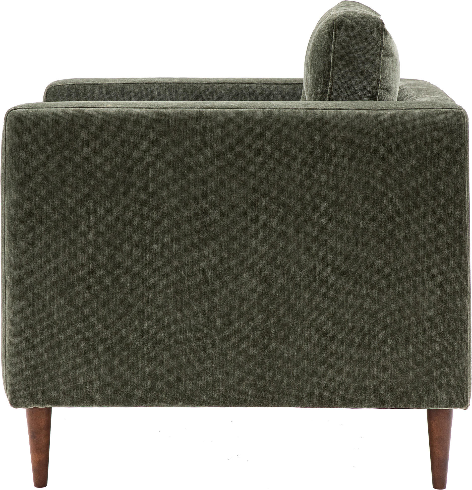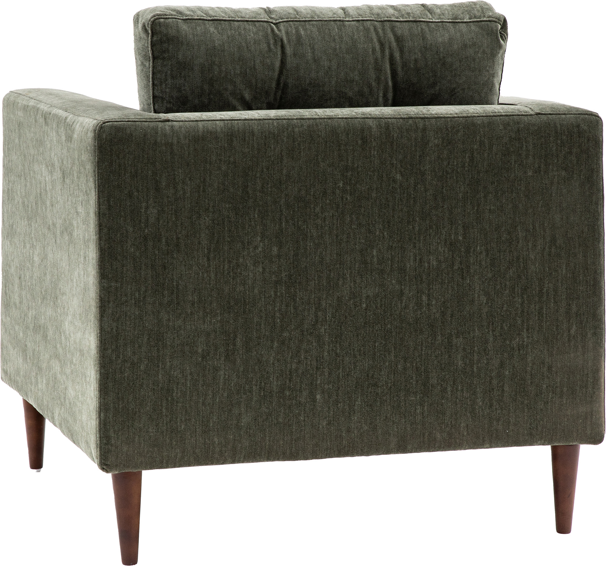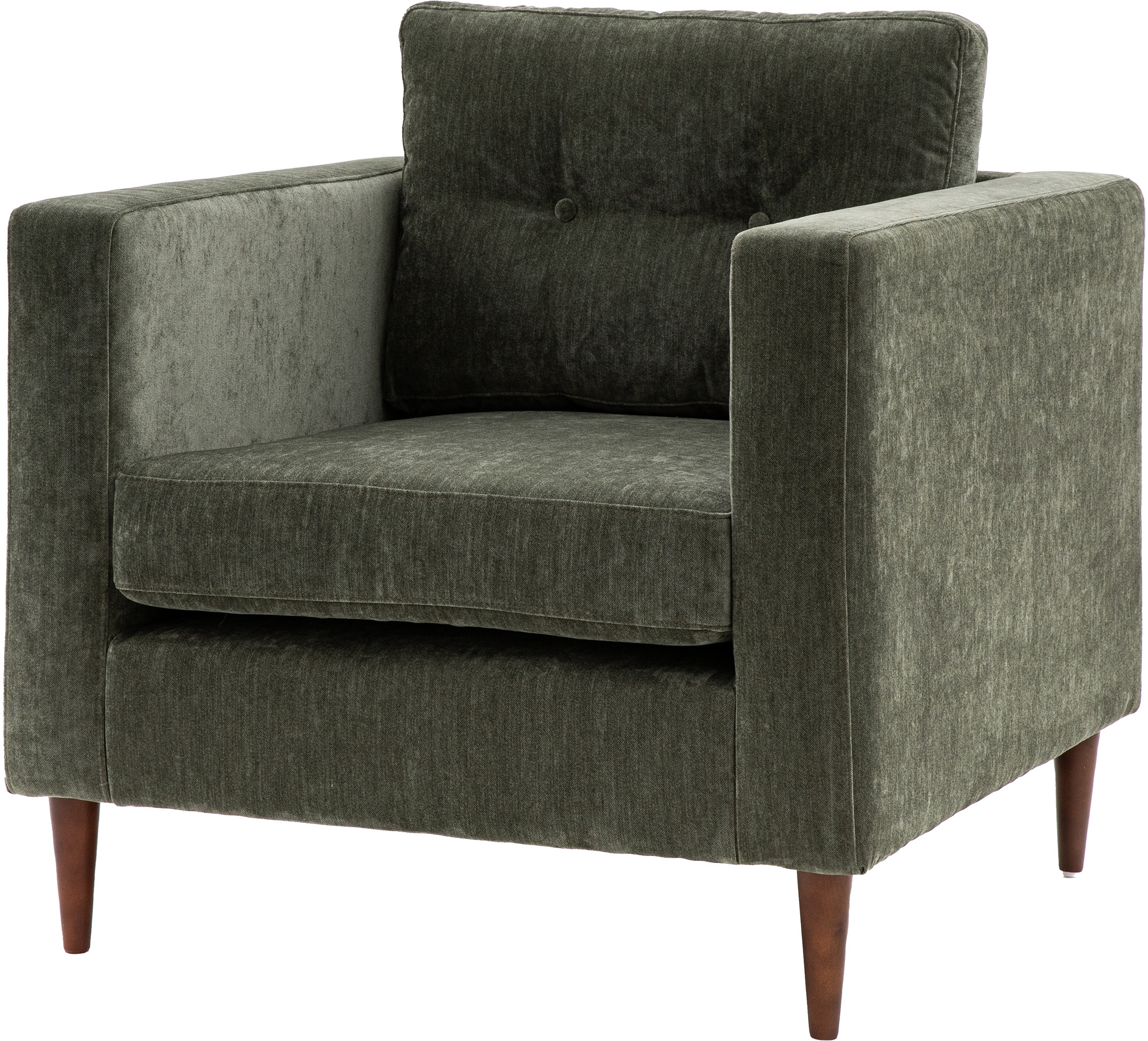 Offering stylish contemporary design, this lovely armchair features sleek lines with block arms and button detailing on the back paired with elegant tapered wooden feet. It is upholstered in a lovely green fabric but is also available in grey and natural. Matching sofas are available.