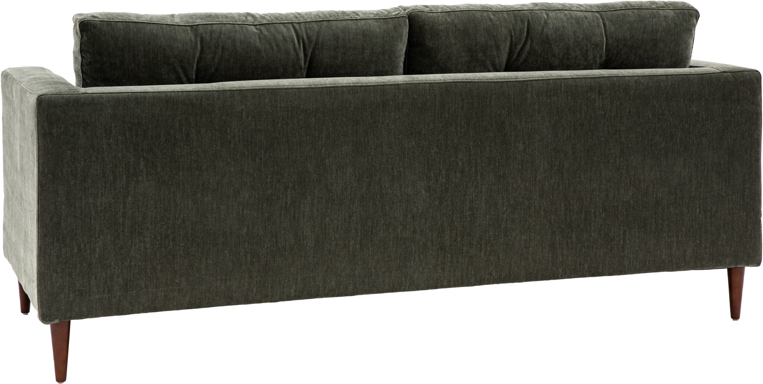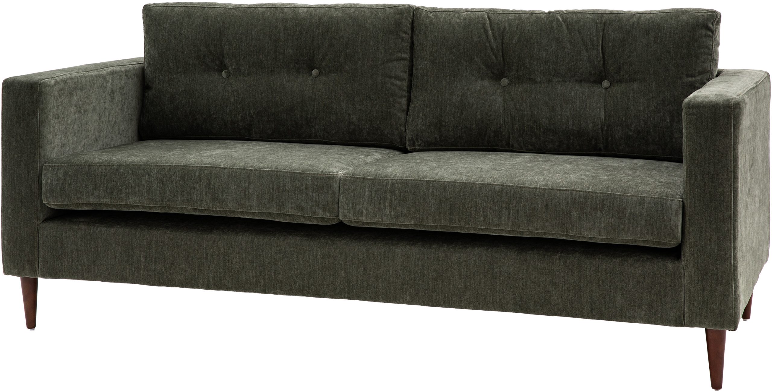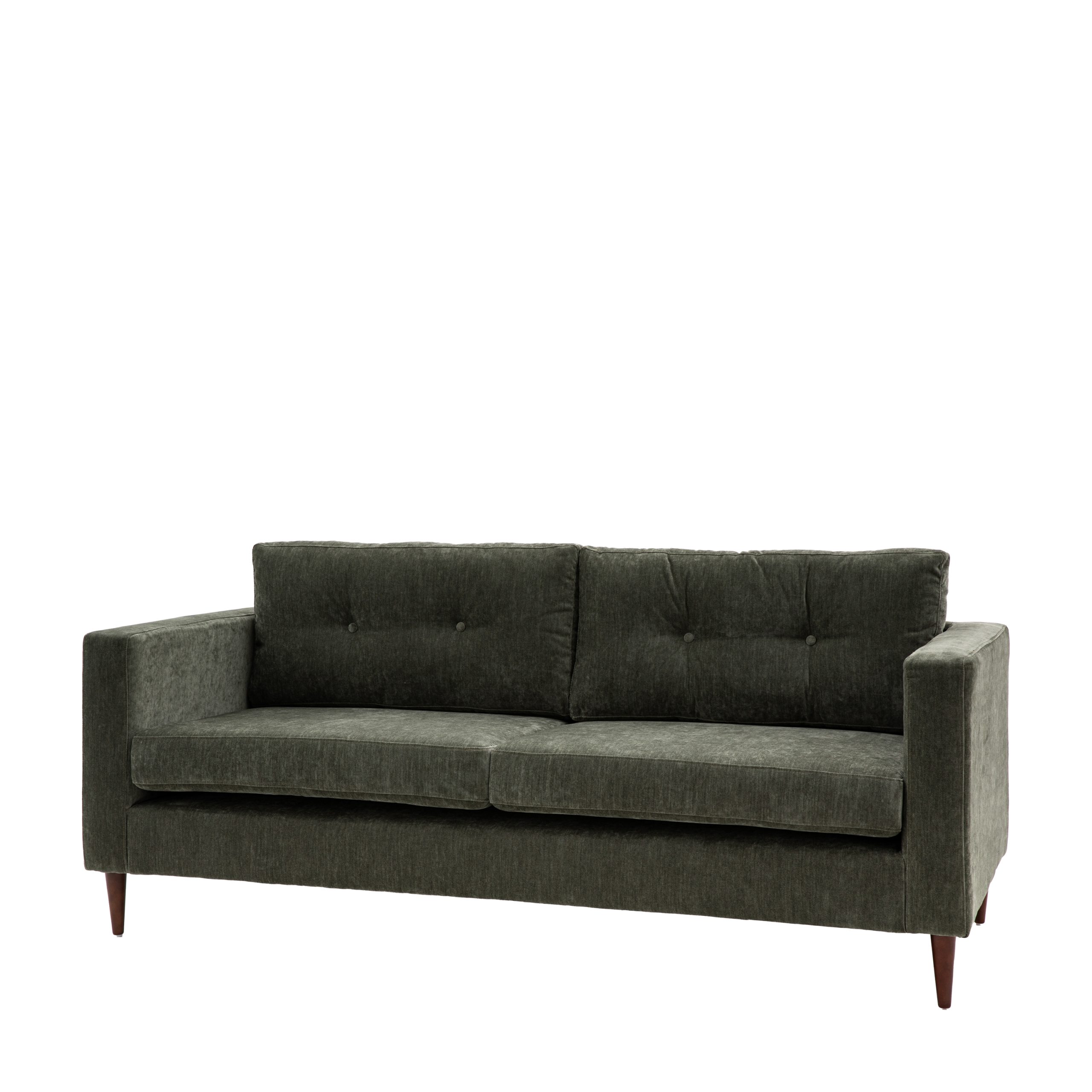 This lovely sofa features sleek lines with block arms and button detailing on the back paired with elegant tapered wooden feet, offering stylish contemporary design. It is upholstered in a lovely green fabric but is also available in grey and natural. A matching armchair and 2-seater sofa are available.