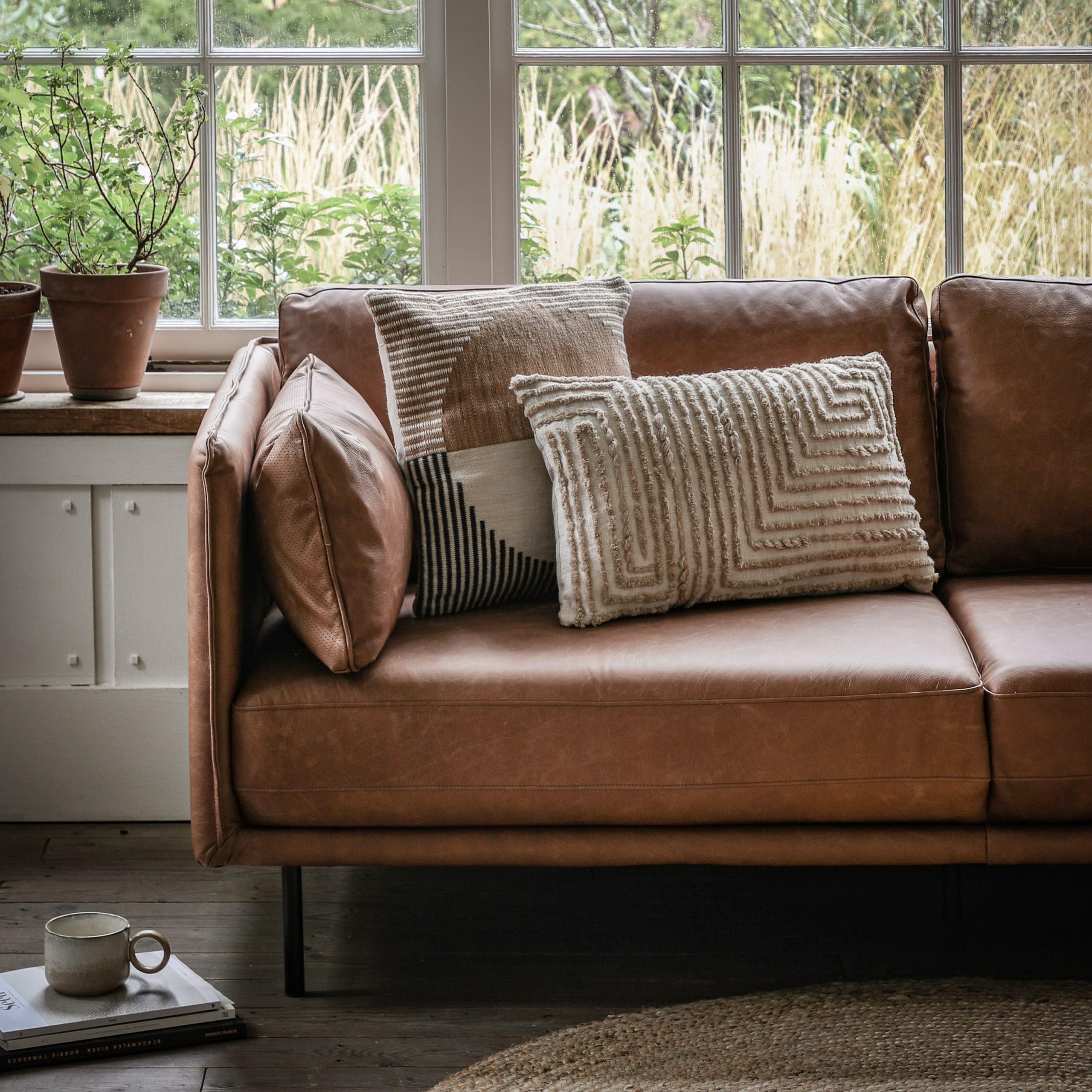Offering a sleek contemporary look, this stylish sofa is fully upholstered in a lovely warm brown leather, with black metal legs perfectly complementing the design. The slim arms feature stitch seam detailing which is echoed on the side cushions.