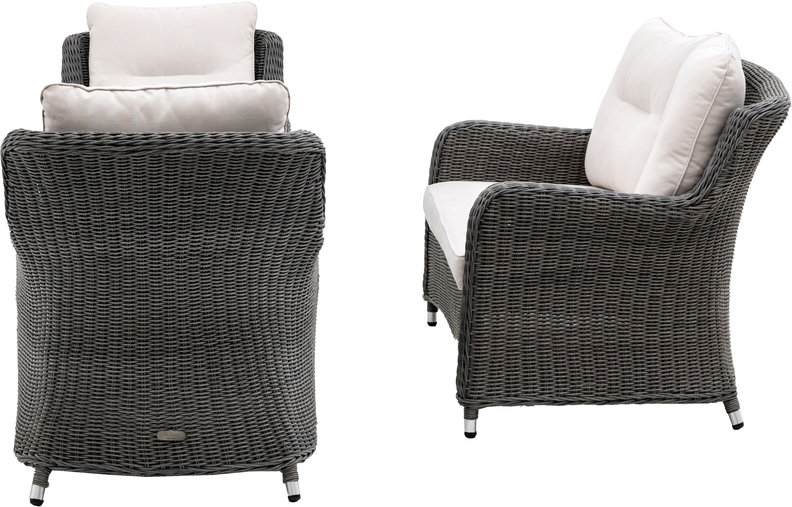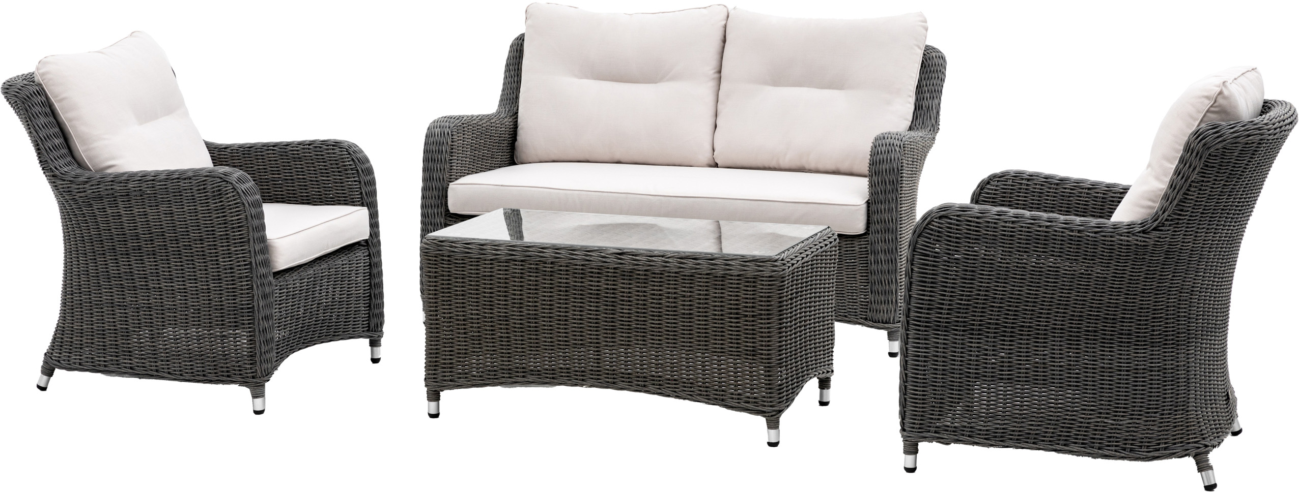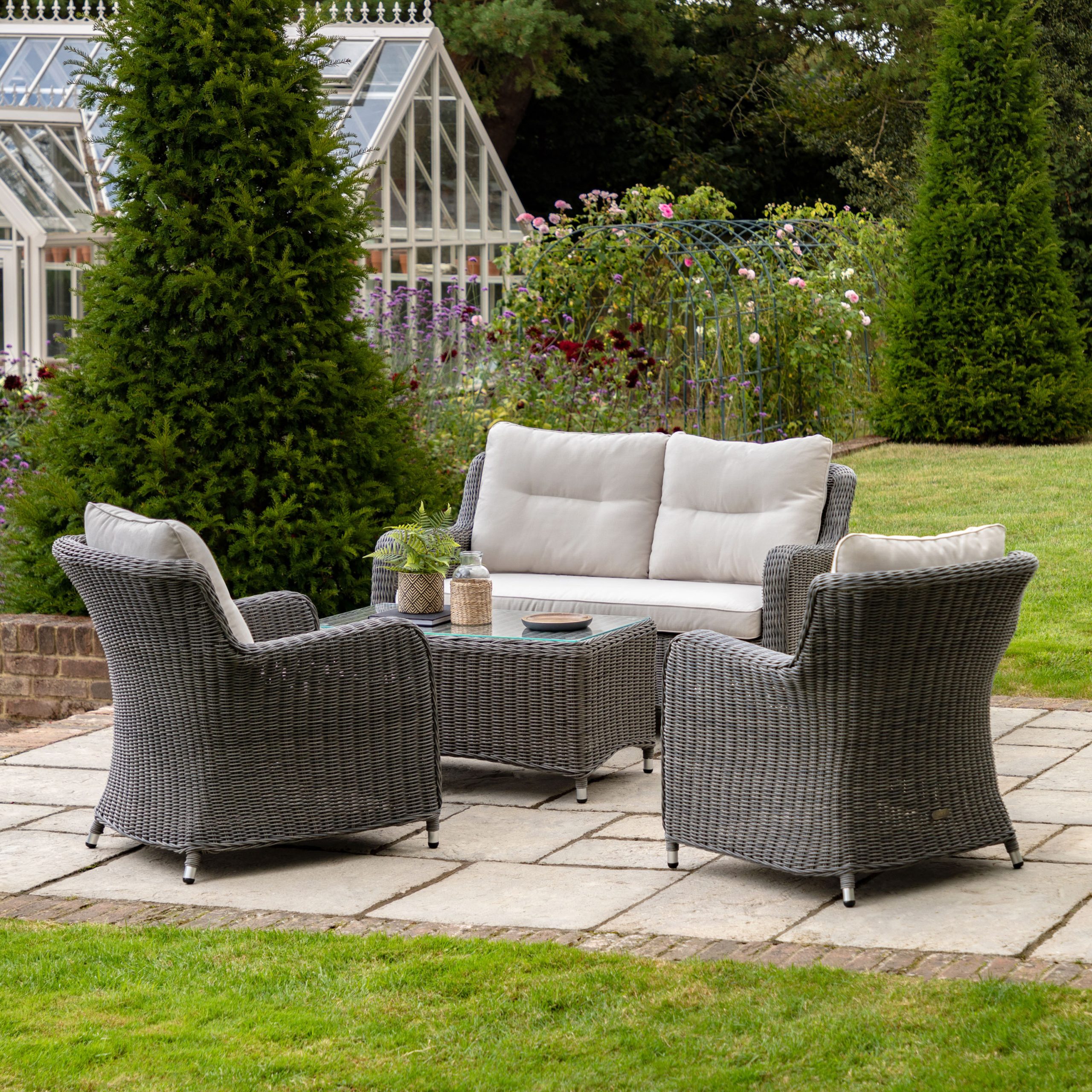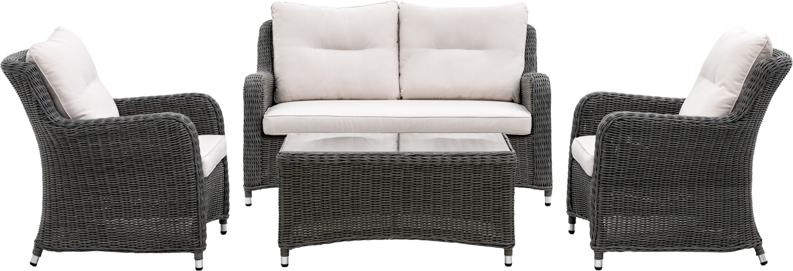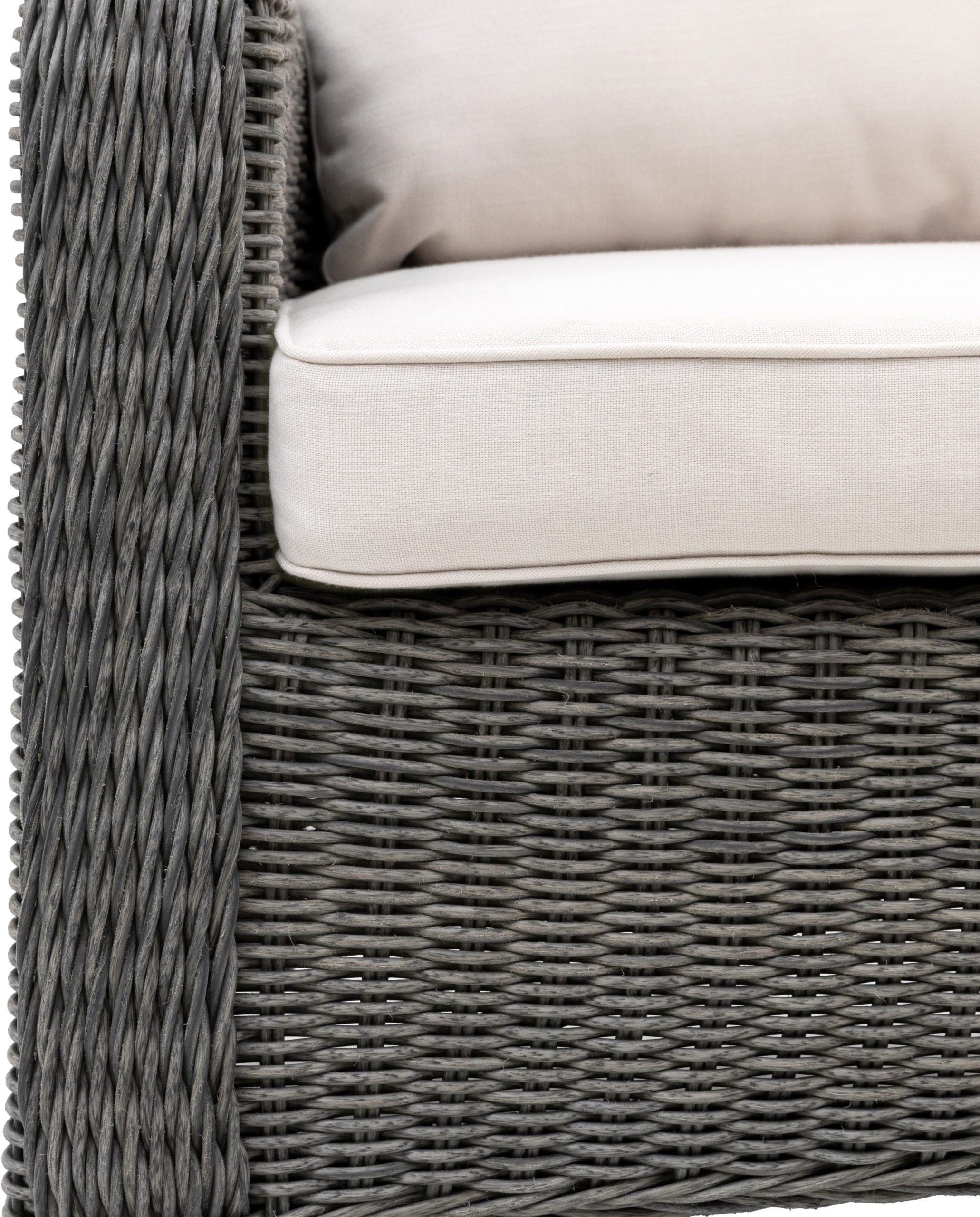 The Gallery Direct Windsor Lounge Set includes two armchairs, a sofa and a coffee table, all crafted with a blend of wicker and plush cushions. The neutral color palette complements any Outdoor decor, while the durable construction ensures years of enjoyment. Perfect for relaxing with family or entertaining guests, this set adds a touch of sophistication to your Outdoor living space.