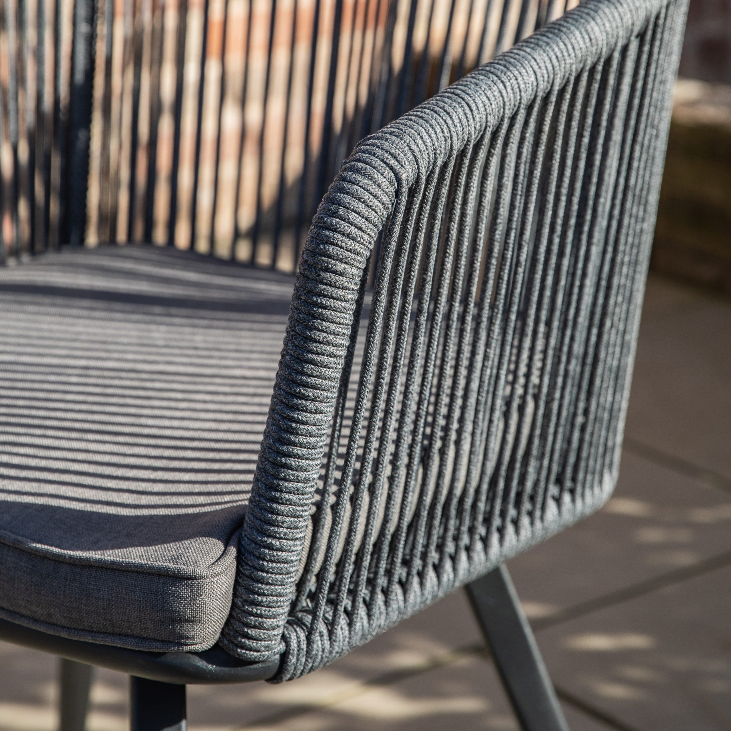 Gallery Outdoor Cassis 2 Seater Bistro/Tea Set This lovely 2 Seater Bistro/Tea Set offers two chairs and a side table, making it ideal for smaller spaces and cosy garden corners. The table and chair frames are made from powder coated aluminium, with weatherproof rope weave for the chair seats and showerproof scandi-style cushions in a coordinating colour for added comfort. A matching dining set is also available.