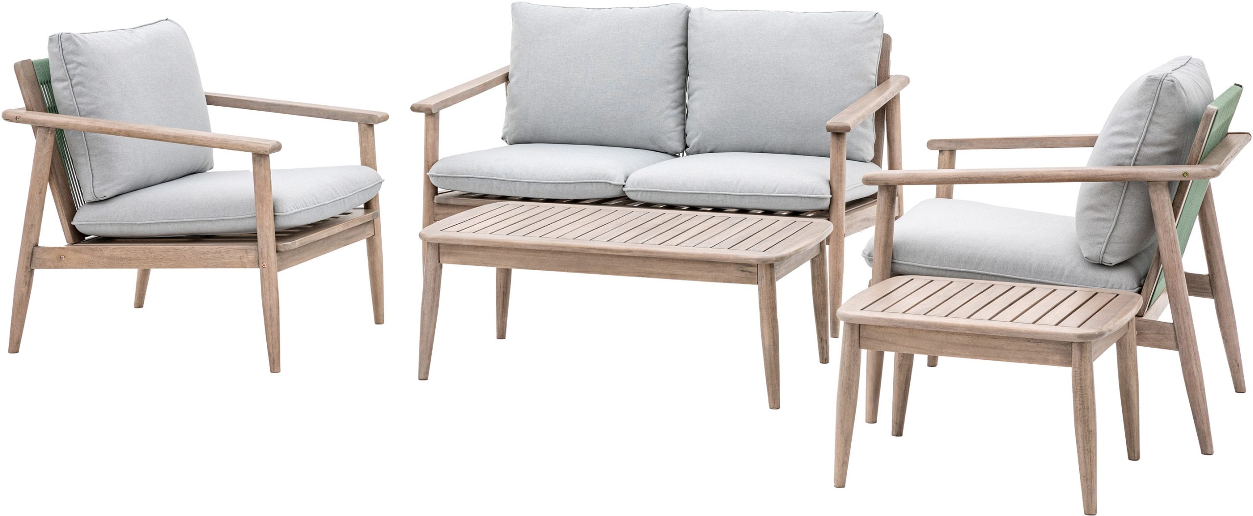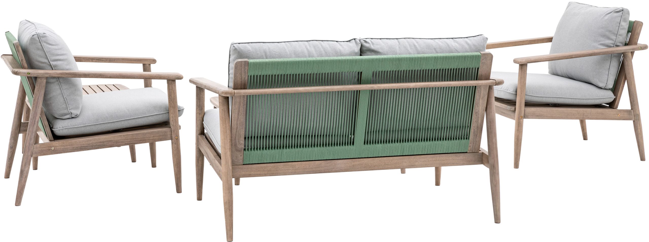 Gallery Outdoor Corsica Lounge Set A contemporary lounge set with chic turned legs, slopped arms and a overall elegant design finished off with grey cushions, perfect for your outside space. Complete with a 2 seater sofa, 2 armchairs and a slatted top coffee table all made from FSC Acacia wood with woven rope chair backs.