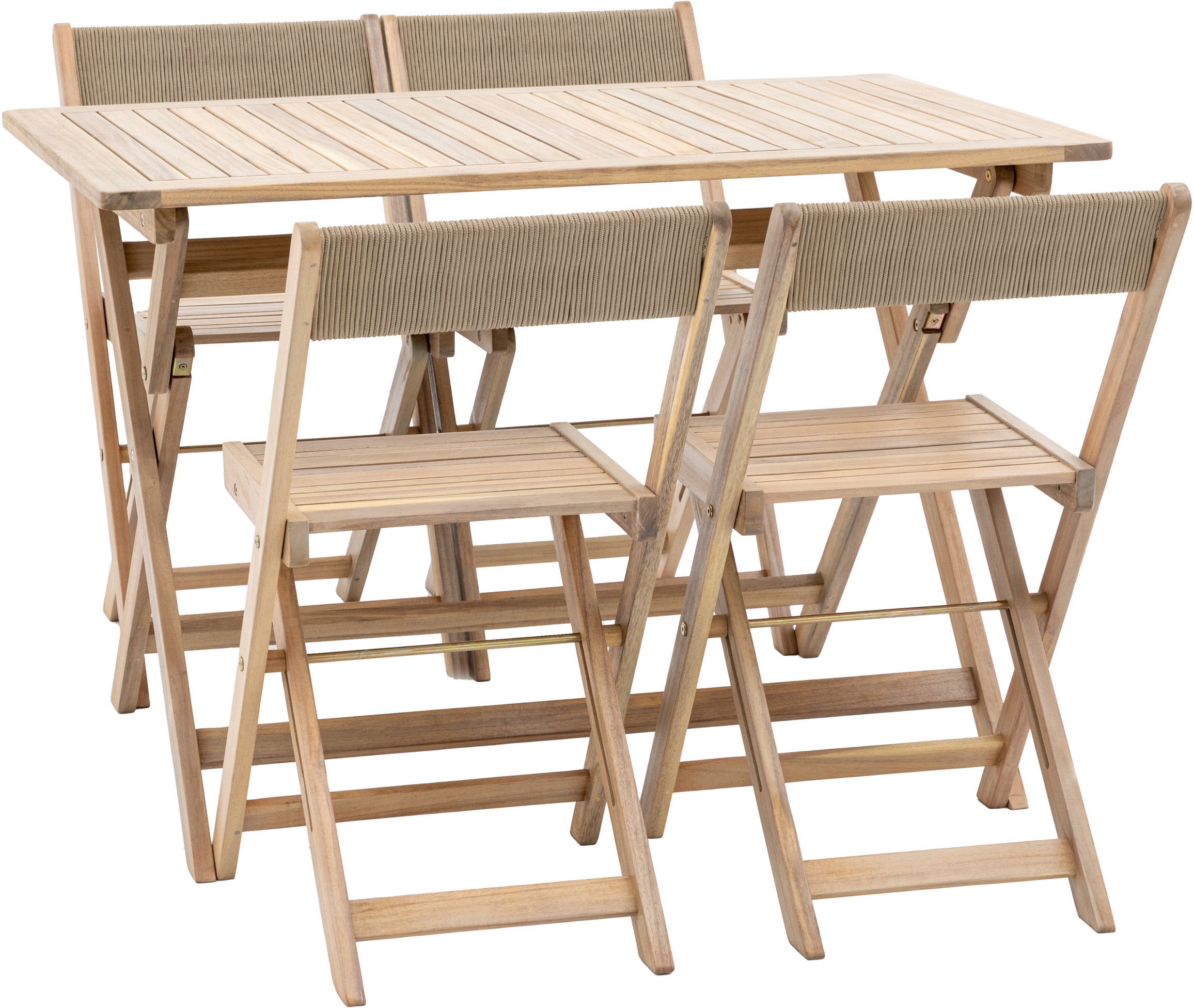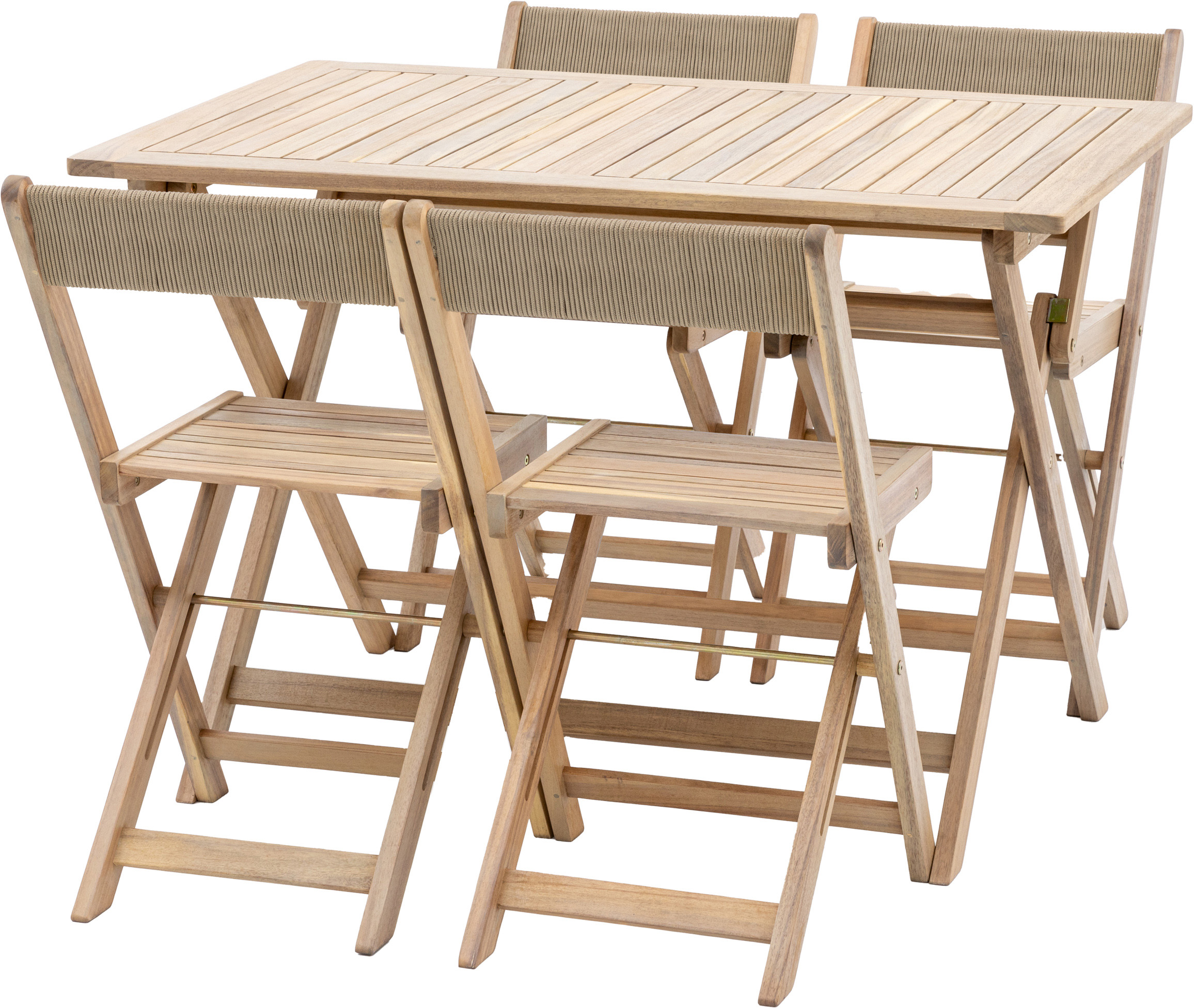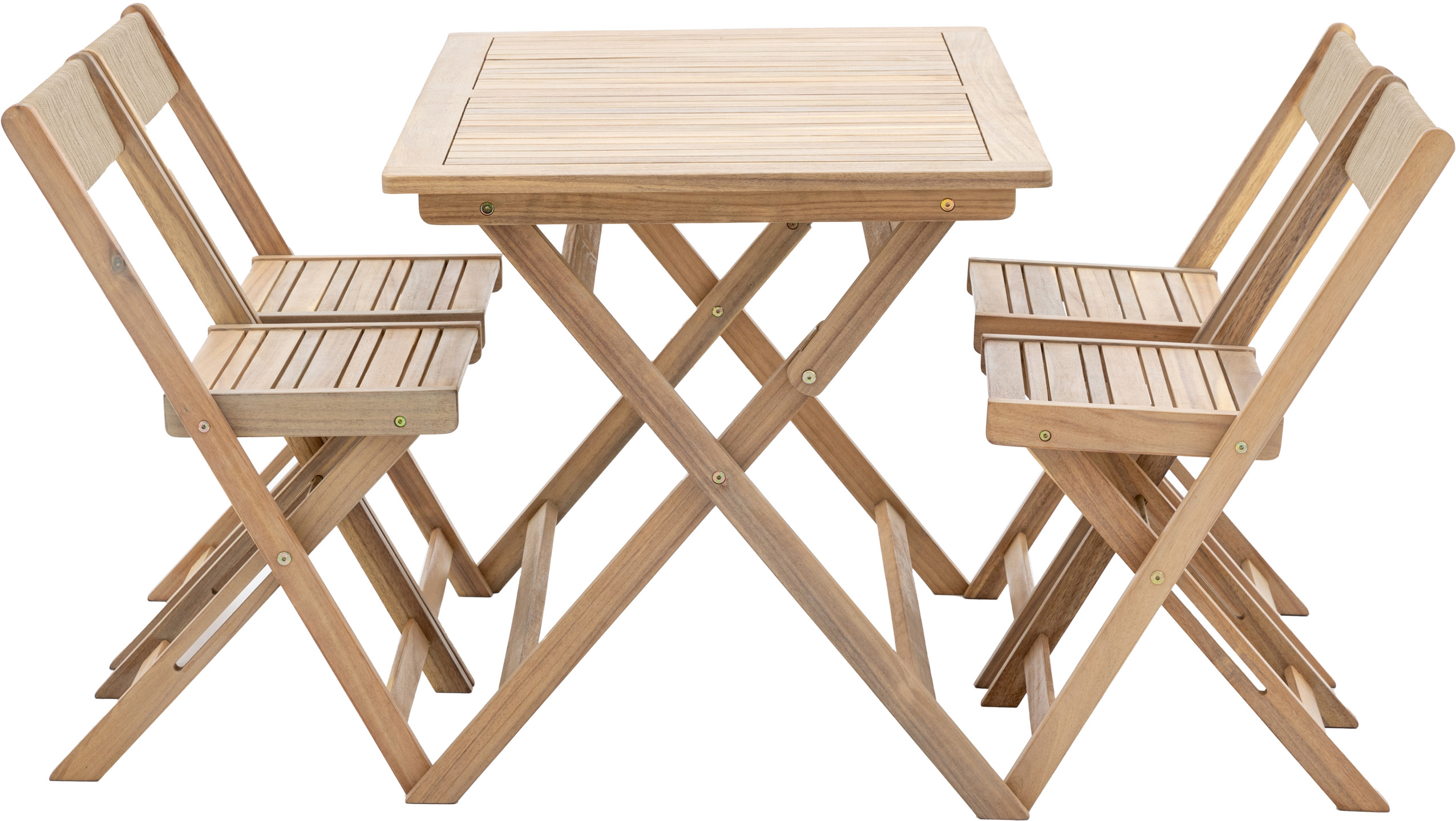 Combining practicality and style this dining set folds away for easy storage or transportation. This elegantly simple set is made with Acacia wood and comes complete with the folding slatted top dining table and folding 4 chairs. Additional coordinating chairs are available separately.