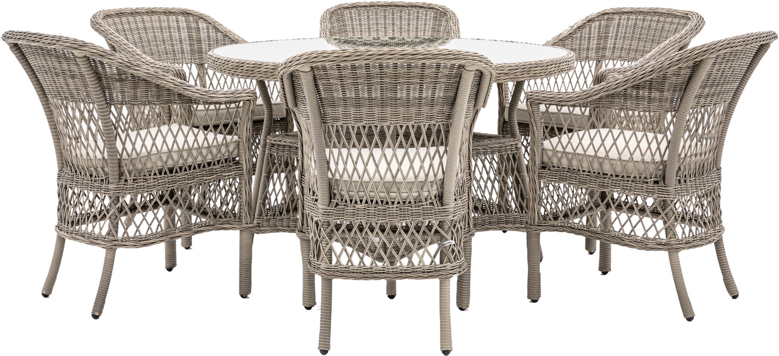 Gallery Outdoor Menton 6 Seater Round Dining Set Charming set of 4 dining chairs with a matching glass topped dining table. The chairs have a luxurious showerproof seat cushions in a soft colour to complement the colour of the rattan while the practical table features a handy storage shelf and parasol hole. Made from all weather hand woven PE rattan with an eye catching combination of open weave and close weave patterns, all in a neutral stone colour. Also available as a 4 seater option and complementary to our Sofa Dining/Tea Set.