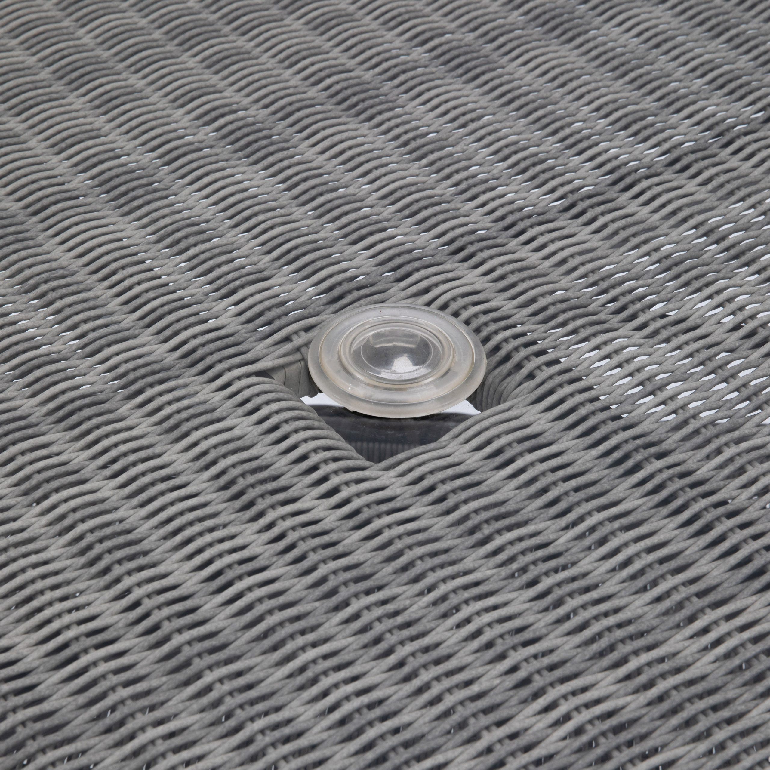 Charming set of 4 dining chairs with a matching glass topped dining table. The chairs have a luxurious showerproof seat cushions in a soft colour to complement the colour of the rattan while the practical table features a handy storage shelf and parasol hole. Made from all weather hand woven PE rattan with an eye catching combination of open weave and close weave patterns, all in a neutral stone colour. Also available as a 4 seater option and complementary to our Sofa Dining/Tea Set.