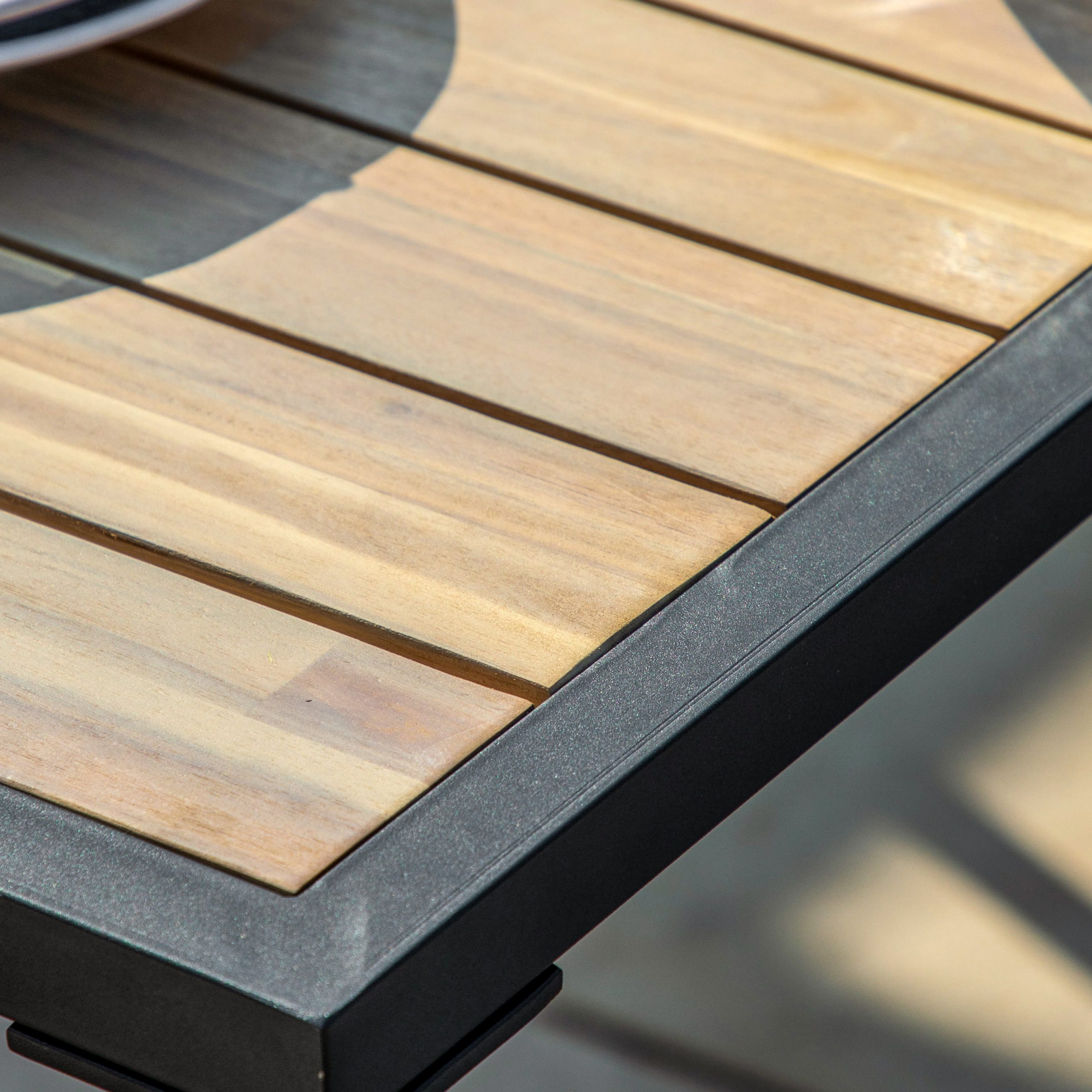 Perfect for BBQ’s this corner dining set is just what you need to relax and enjoy the summer evenings. There’s plenty of seating with 2 single stools, a dining bench and a corner sofa finished with comfortable grey cushions around modern a dining table, all made from Acacia wood with a simple black powder coated metal frame.