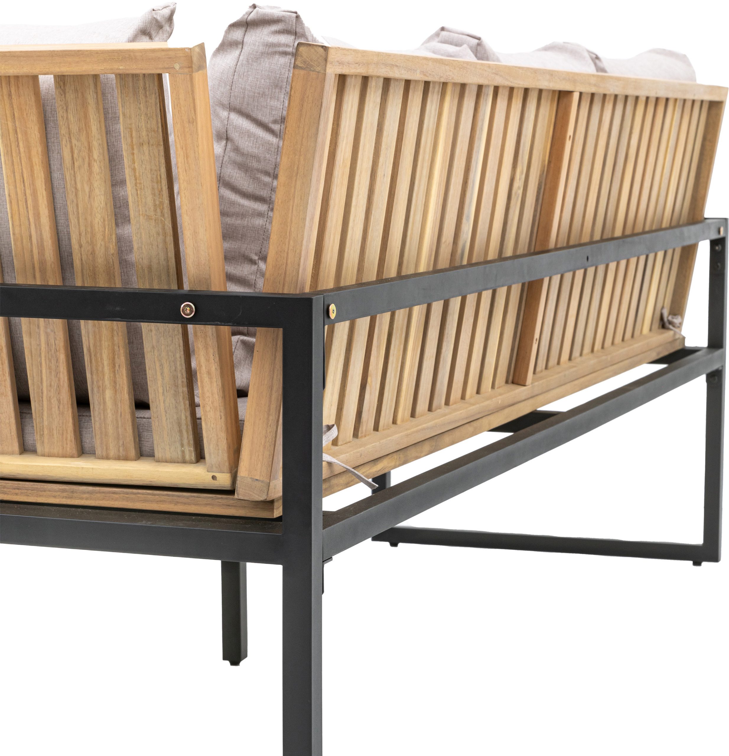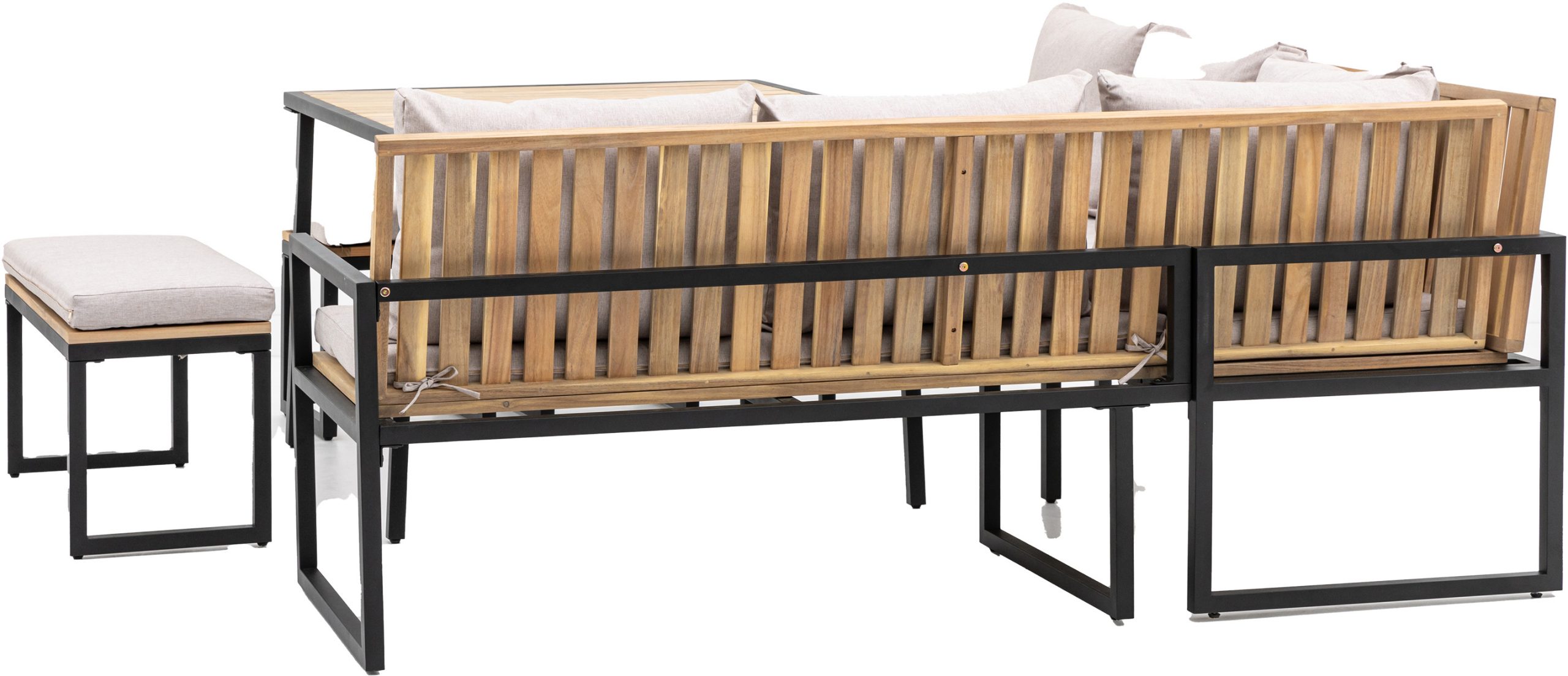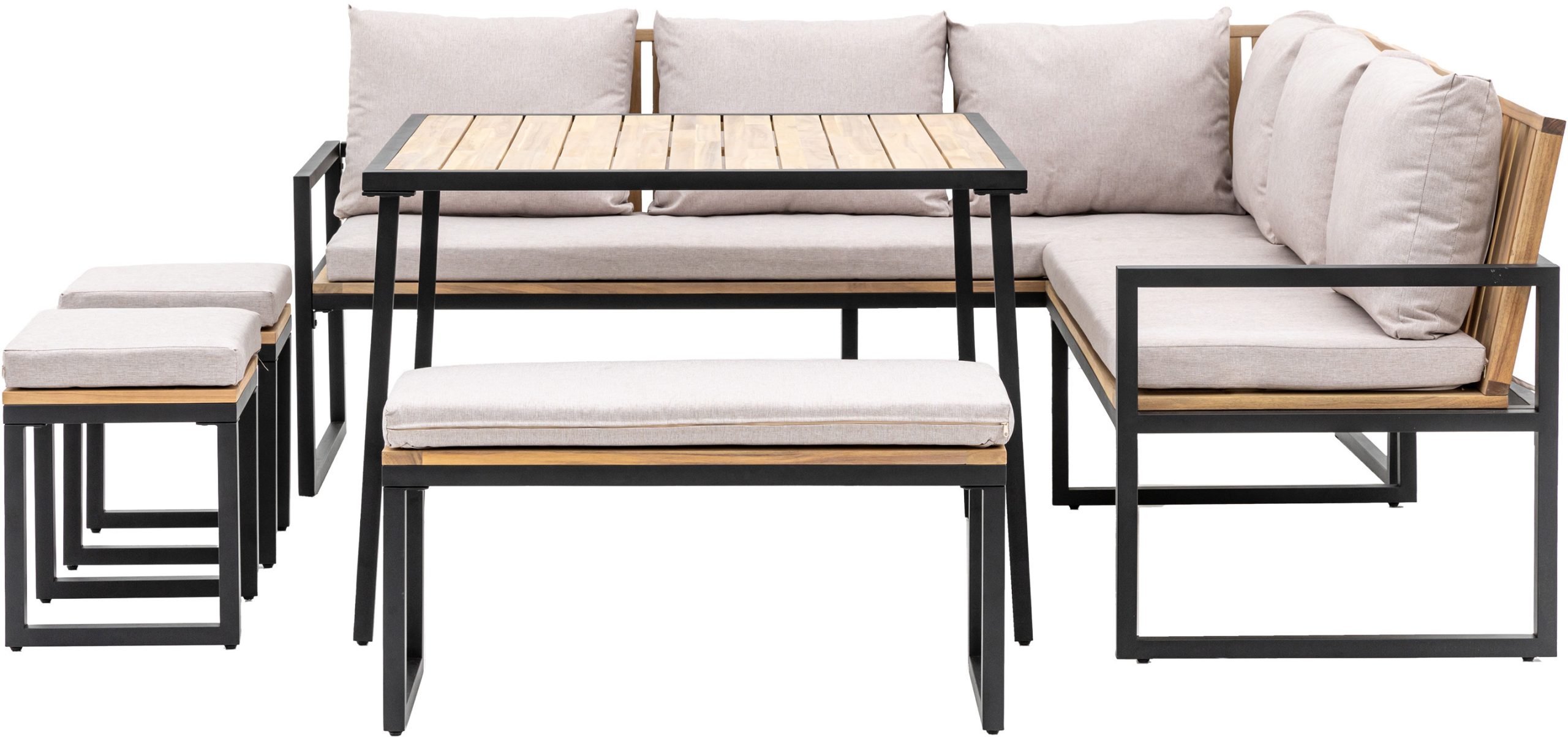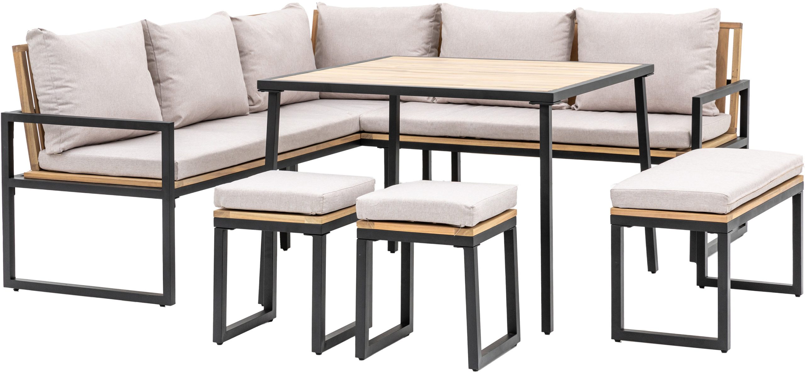 Gallery Outdoor Naples Corner Dining Set Perfect for BBQ’s this corner dining set is just what you need to relax and enjoy the summer evenings. There’s plenty of seating with 2 single stools, a dining bench and a corner sofa finished with comfortable grey cushions around modern a dining table, all made from FSC Acacia with a simple black powder coated metal frame.