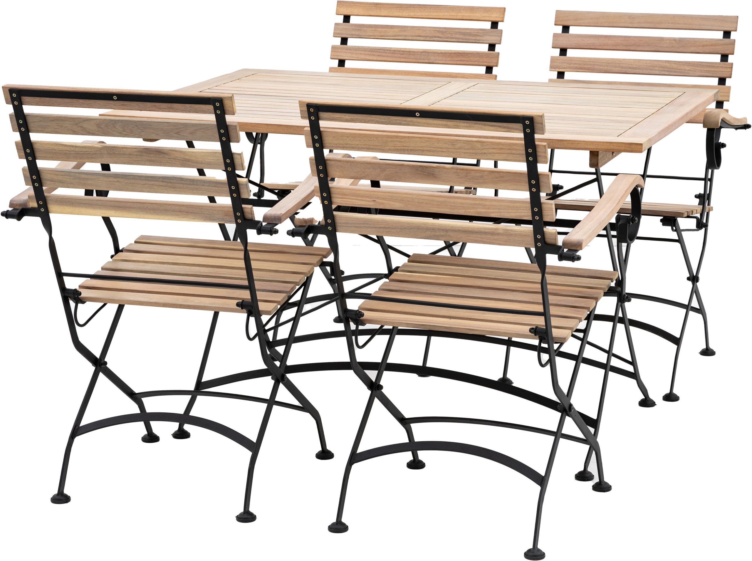 Gallery Outdoor Valetta Folding Dining Set Add a modern industrial look to your Outdoor space with this bold dining set which includes four chairs and a table, all of which fold for easy storage. They are crafted from acacia wood with a natural finish and contrasting industrial style dark powder coated metal, making a style statement, perfect for a modern urban garden.
