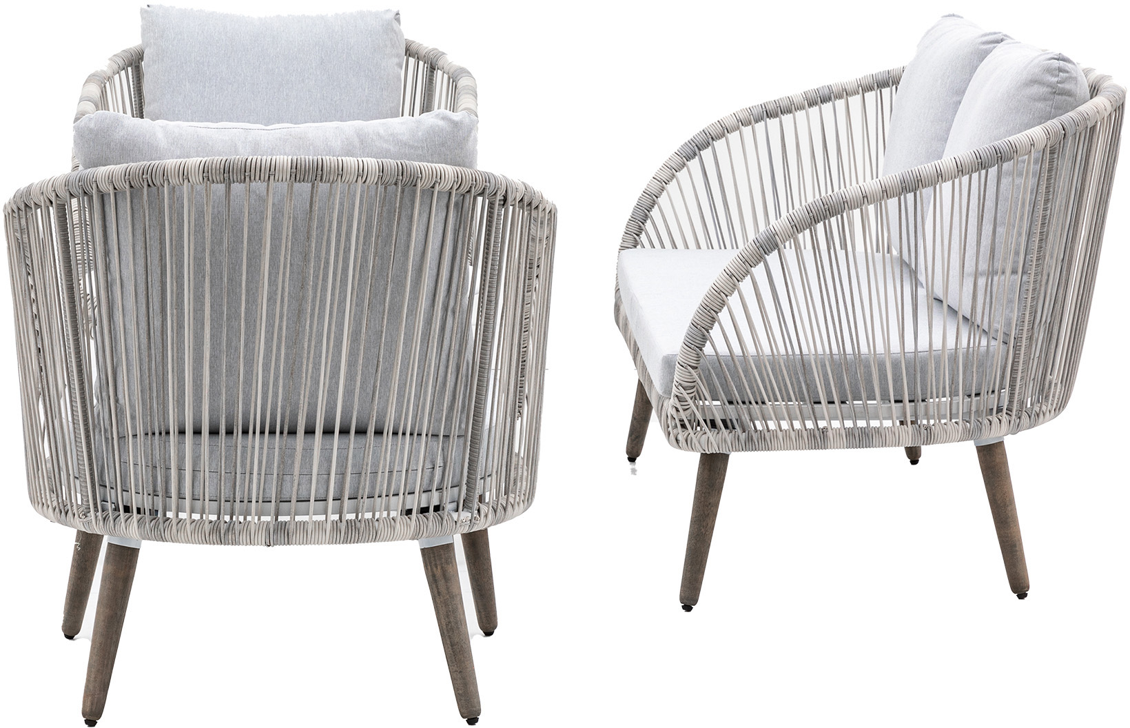 Modern and light this lounge set will update your Outdoor space with its woven wicker detail and chic turned legs. The set includes 2 armchairs, a 2 seater sofa and coordinating coffee table made with wicker, steel and UKFR foam with wooden legs.