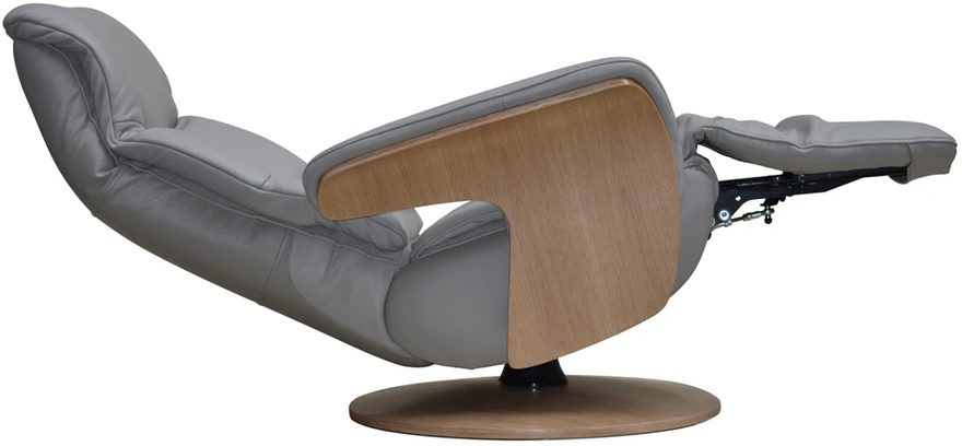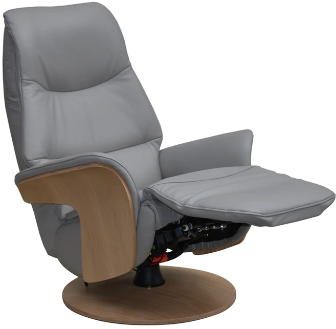 Global Furniture Alliance Iowa Swivel Chair in Pale Grey The Iowa electric recliner has a beautiful Scandinavian design feel, with light wood arm casing and matching round base. Thoroughly designed for your comfort, it has a dual battery, enabling you to operate the foot and back rest separately, helping you to stay comfortable for longer periods of time. It features an adjustable headrest which enables you to recline into the perfect position and a handy cordless magnetic handset, making sure all those unsightly cables are nowhere to be seen!