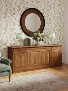 Laura Ashley Garrat Honey 4 Door 3 Drawer Sideboard The Laura Ashley Garrat furniture range is a timeless collection that combines traditional craftsmanship with warm, classic design elements. With its solid wood construction and antique-inspired finishes, the Garrat range is perfect for those who appreciate enduring style and durability.