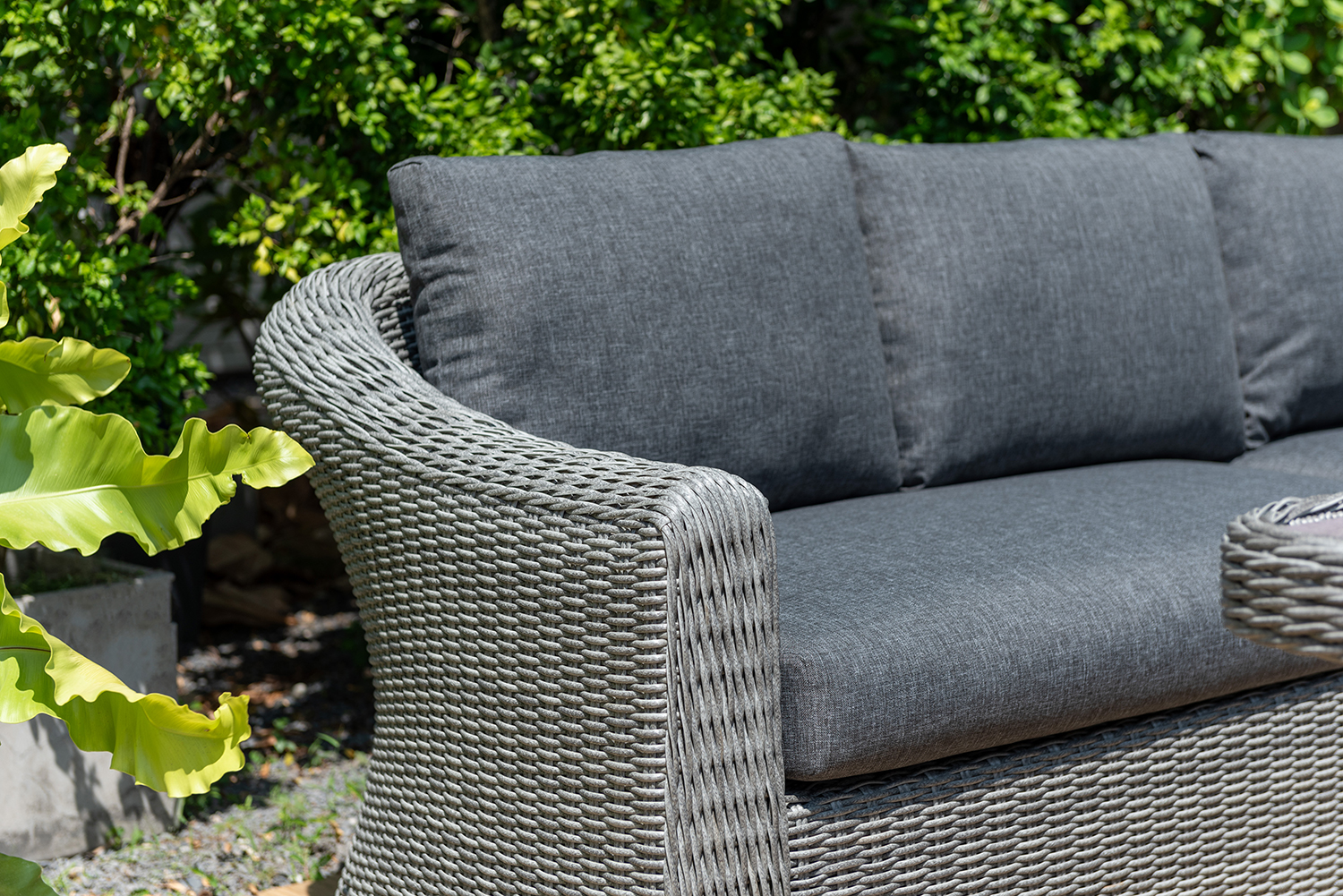 The collection’s sleek frames are made from lightweight, powder-coated aluminum, known for its strength and resistance to rust and corrosion. These frames provide stability and reliability, even in challenging weather or coastal climates. The handwoven Petan® wicker mimics the natural beauty of rattan, offering excellent durability, UV resistance, and easy maintenance. Its flexibility and soft texture enhance comfort without sacrificing resilience.