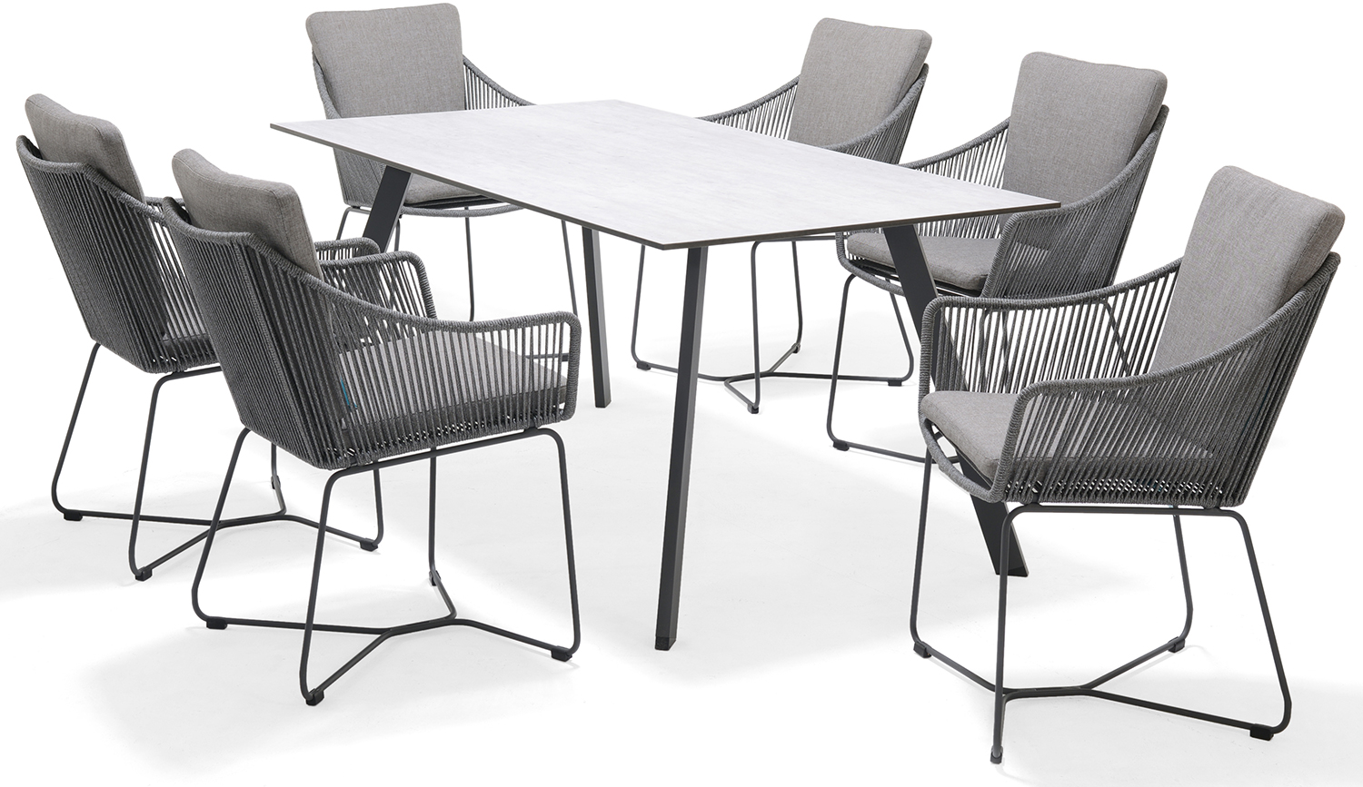 Opal Rectangular 6 Seat Dining Set High pressure Laminate tables paired with Aluminium frames allows for a robust and stylish addition to any garden. By finishing the dining range with our Olefin rope, alongside reclining seating on the sofa sets, the Opel range offers a full package of stylish, premium furniture, with no compromise taken on its flexibility.