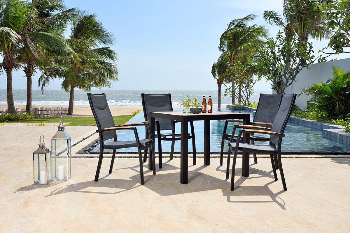 The Panama 4 Seat Stacking Dining Set – Weathernet by Lifestyle Garden is part of their Duraocean range characterised by contempory design and the combination of modern materials. Sleek, minimum maintenance Aluminium set featuring industry leading Weathernet mesh for a versatile construction that ticks all the boxes in outdoor living including resistance to Water and UV rays . So what are you waiting for? Add a touch of modern refinement to your home today and invest in the LifestyleGarden Panama range. LifestyleGarden®’s AluPrint® is a patented way of printing beautiful wood finishes onto aluminium profiles to lift the look of the material to the next level. Done entirely in-house, this finish adds a natural look to the metal, while maintaining a very low weight and high durability. AluPrint® also allows adds details to the products that adds just that extra touch to the pieces of any outdoor space and allowing for zero maintenance and premium weather resistance.