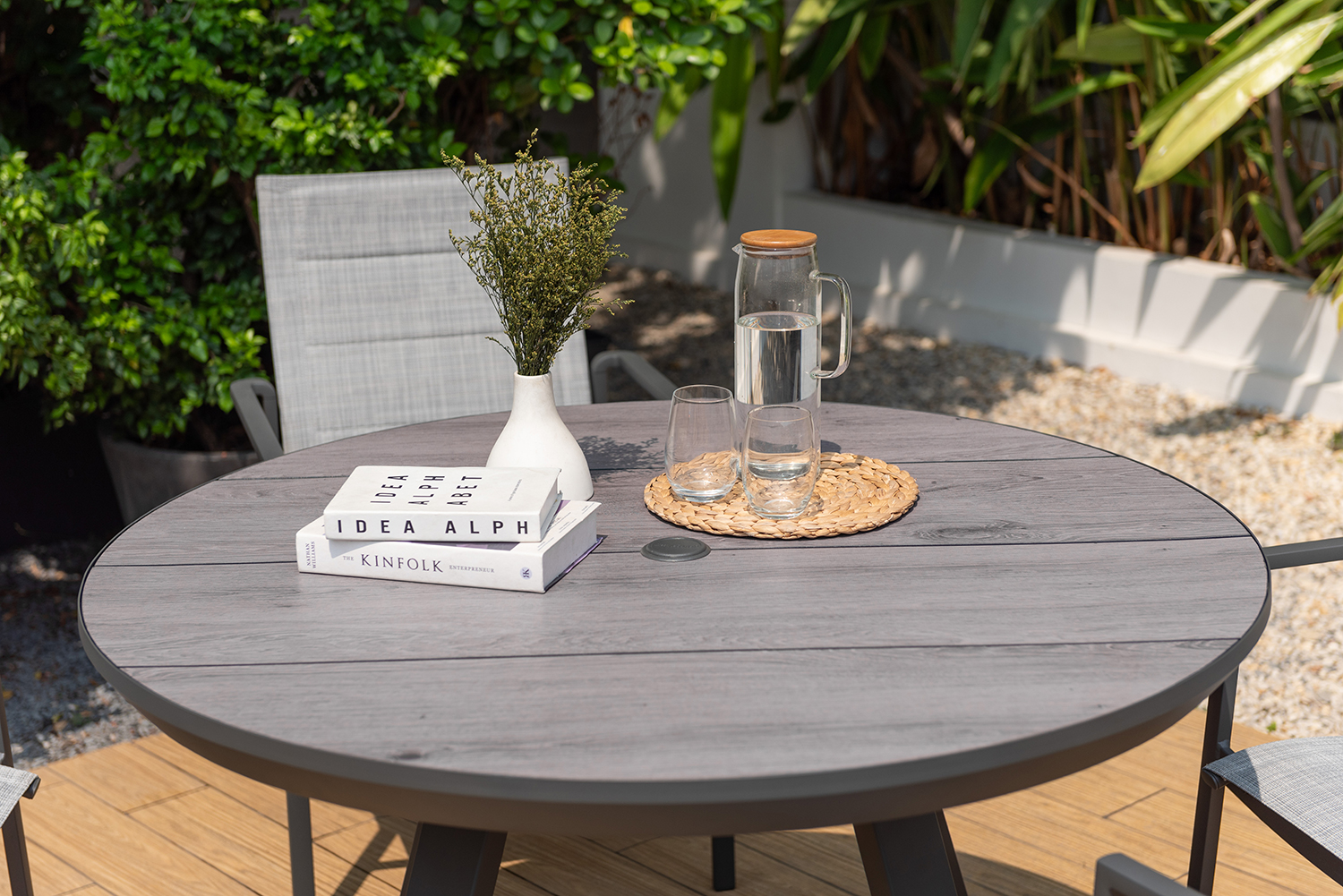 This Set comprises: • 1 x Urbanite Round Dining Table (W-120cm D-120cm H-75cm) • 4 x Urbanite Panama Chairs (W-61cm D-65cm H-94cm)