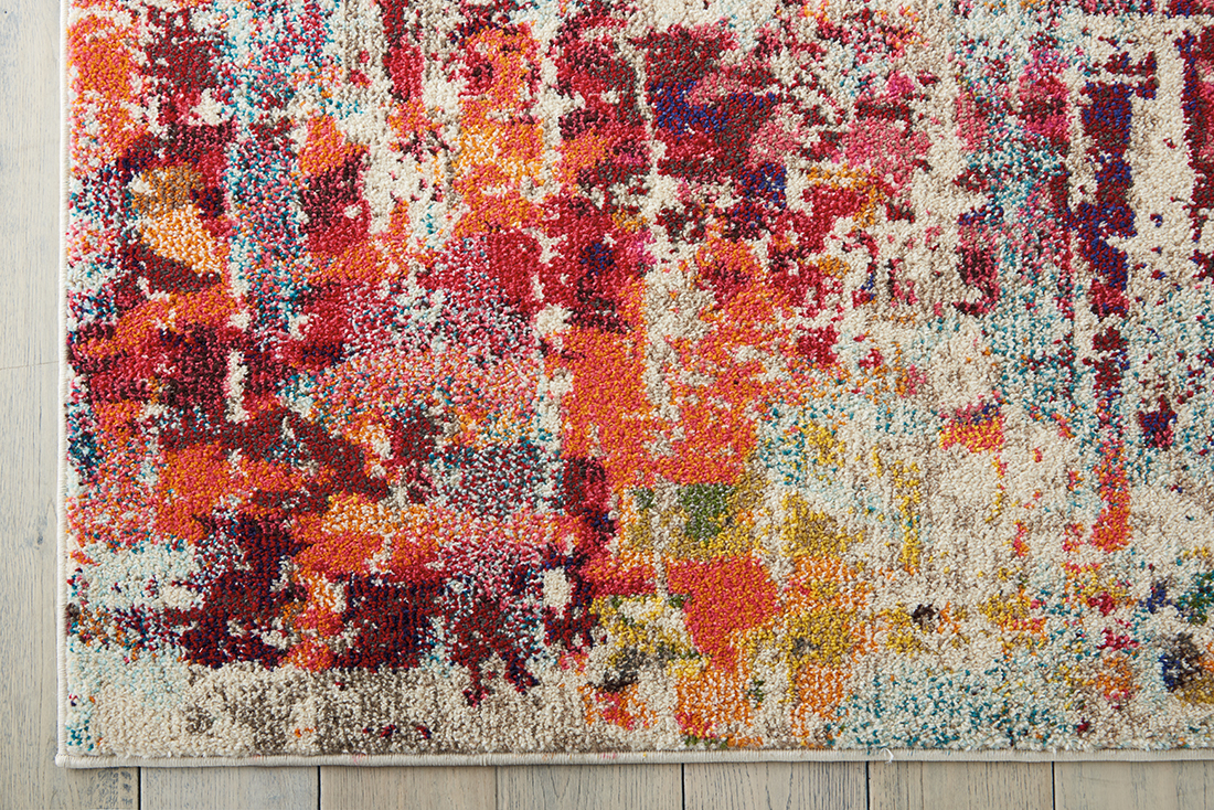 Bright colorful tones and distressed effects make this Celestial Collection rug an eye-catching artistic statement. The beautifully bohemian tones and silky tex ture add a note of casual comfort to any room in the home.