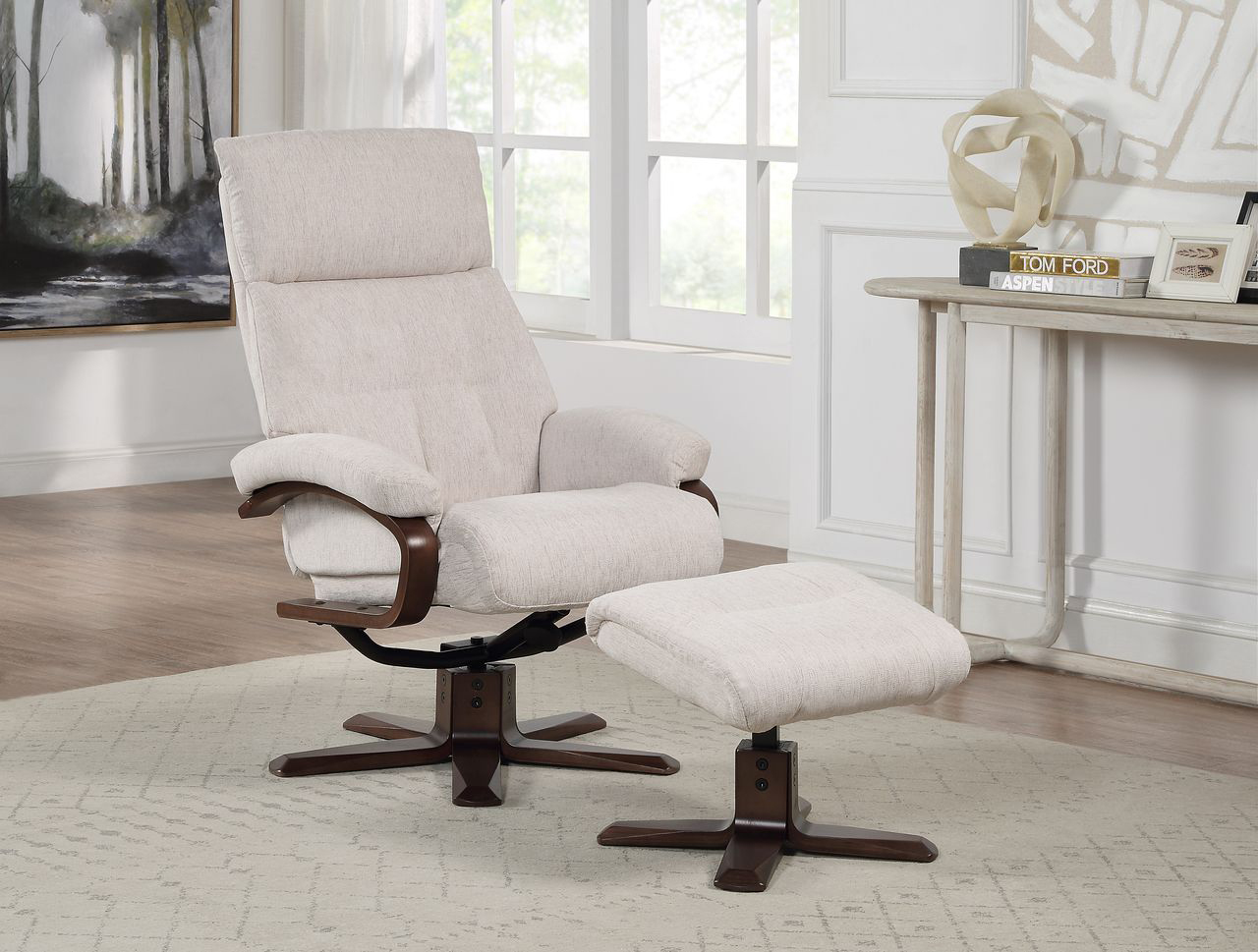 Global Furniture Alliance Vienna Chair in Beige Fabric The Vienna Swivel Recliner & Footstool stands out as a piece that brings elegance and sophistication to any room. Available in a variety of versatile fabrics and leathers, it effortlessly complements any décor.