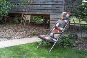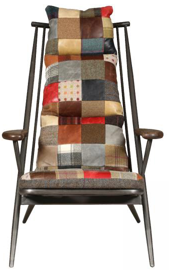 The Vintage Sofa Company Ely Patchwork Studio Chair features a distressed aluminum framework, solid oak armrests and industrial chic design. The patchwork back cushion is removable and has straps to tie it to the frame.
