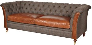 The Vintage Sofa Company Granby 3 Seat Sofa in Moreland Fabric features a harmonic blend of genuine moreland harris tweed fabric and cerato brown leather, packaged together perfectly in a traditonal country aesthetic. The sofa features a solid oak frame, castor legs and a hand buttoned back to give even more vintage appeal.
