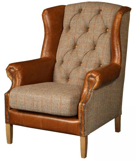 Vintage Sofa Company Kew Armchair The Kew Armchair is the ultimate choice in wingback chairs and offers superior comfort and style with beautiful rolled arms and prominent natural finish solid oak legs. The Kew Armchair is shown in genuine Harris Tweed ‘Hunting Lodge’ fabric, with arms and headrest in Cerato Brown aniline leather. The chair features beautiful hand-buttoned detailing and studwork on the arm fronts. The Kew Armchair teams perfectly with the Chester Club or the Granby sofa collections, or, it is equally at home as a statement piece.