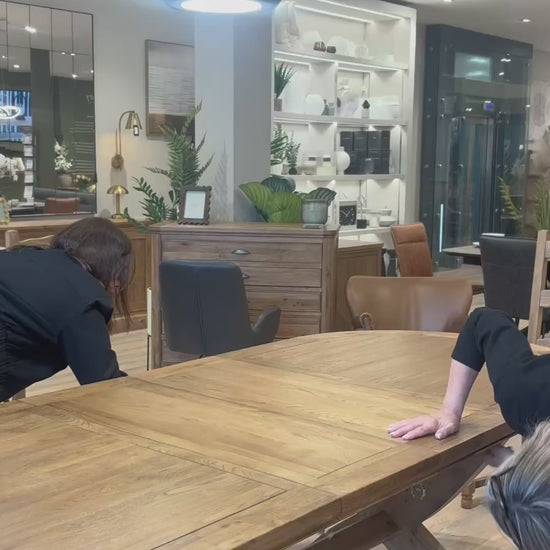 Make a stunning statement with the Carlton Furniture Copeland 1800 Cross Leg Oval Extending Dining Table. This magnificent piece combines the graceful flow of an oval top with the dramatic geometry of distinctive X-frame cross legs, all crafted in beautiful natural oak. Perfect for dining rooms, contemporary spaces, and design-conscious homes, the Copeland table brings architectural presence and flexible seating that transforms every meal into a special occasion.