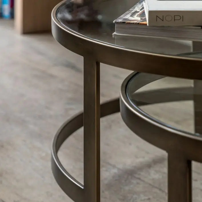 Gallery Direct Monti Nest of 2 Tables combines form and function with its sophisticated design. The pair features bronze-toned metal frames and toughened glass tops, defined by distinctive curved architectural bases. Each table works beautifully on its own or nested together, offering flexible styling for any room. The smaller table tucks seamlessly beneath the larger piece, making this set ideal for maximising space without compromising on contemporary elegance. Perfect for modern and traditional interiors seeking refined, practical furniture.