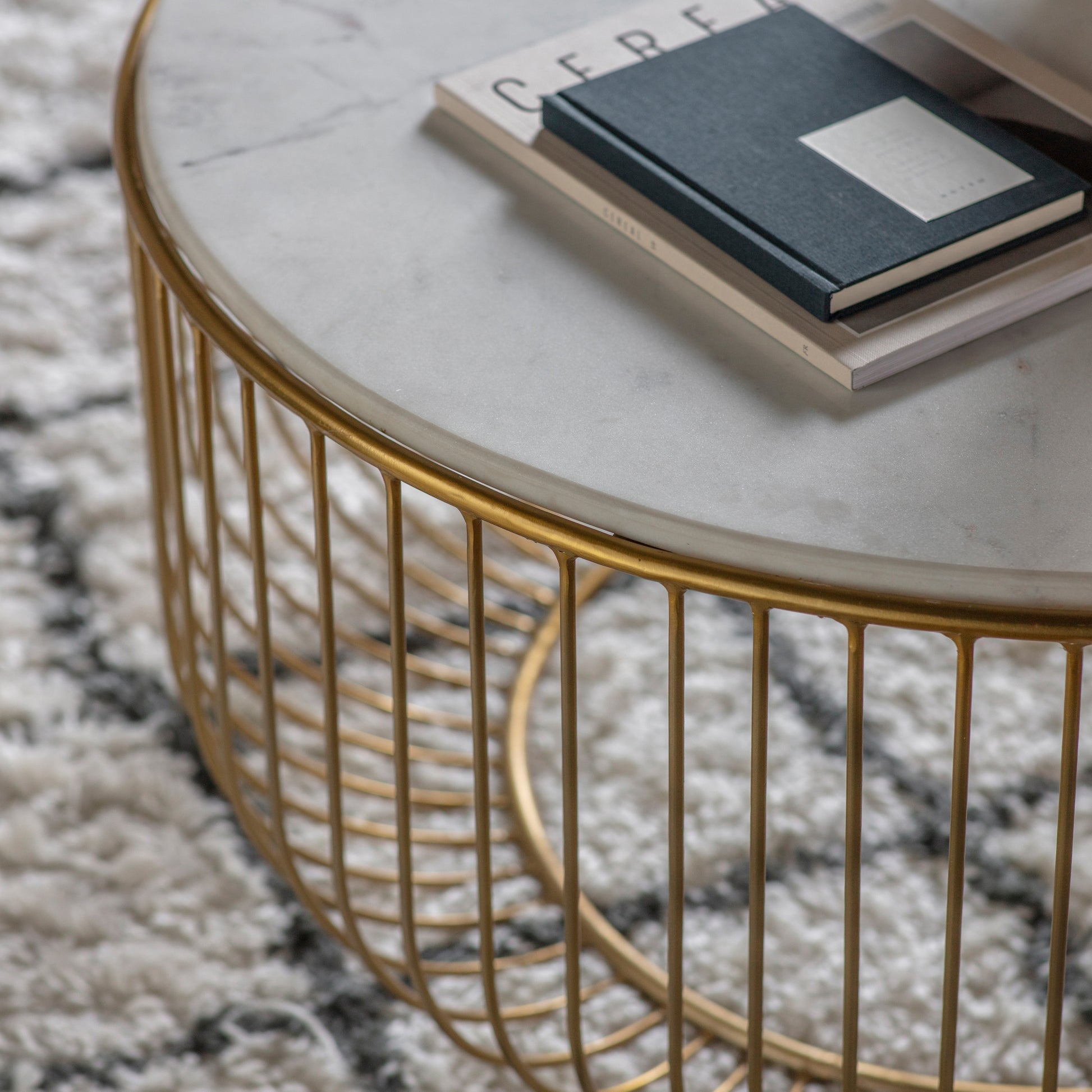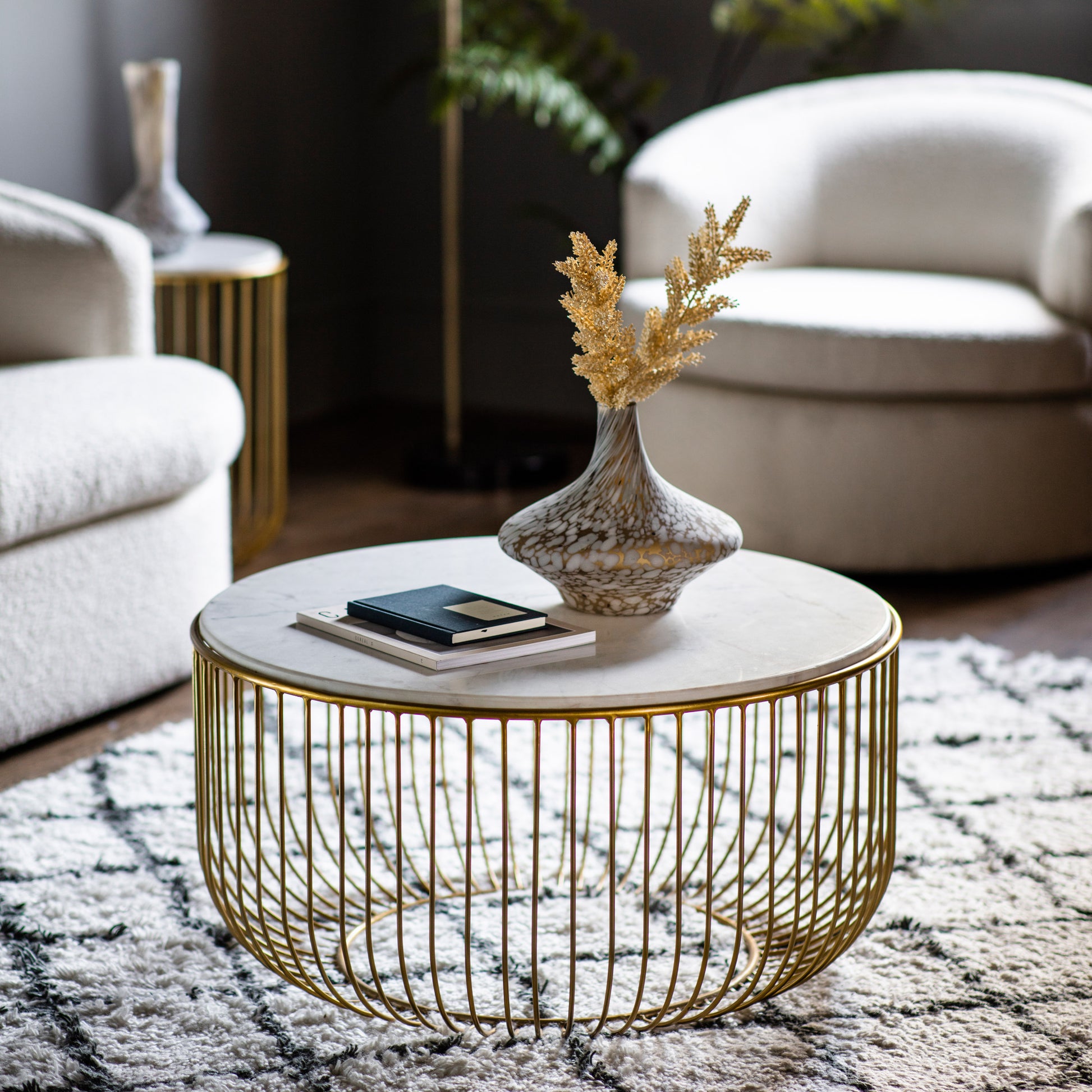 Elevate your interior with the Gallery Direct Riley Coffee Table, where refined craftsmanship meets contemporary elegance. The striking brushed brass wire base provides architectural interest whilst the pristine white marble top delivers timeless sophistication. This statement piece seamlessly balances visual lightness with substantial presence, making it an ideal focal point for modern and transitional spaces alike. Coordinate with the matching Riley Side Table to complete a curated look, or explore the collection in black for a bolder aesthetic. A versatile investment in luxury living.