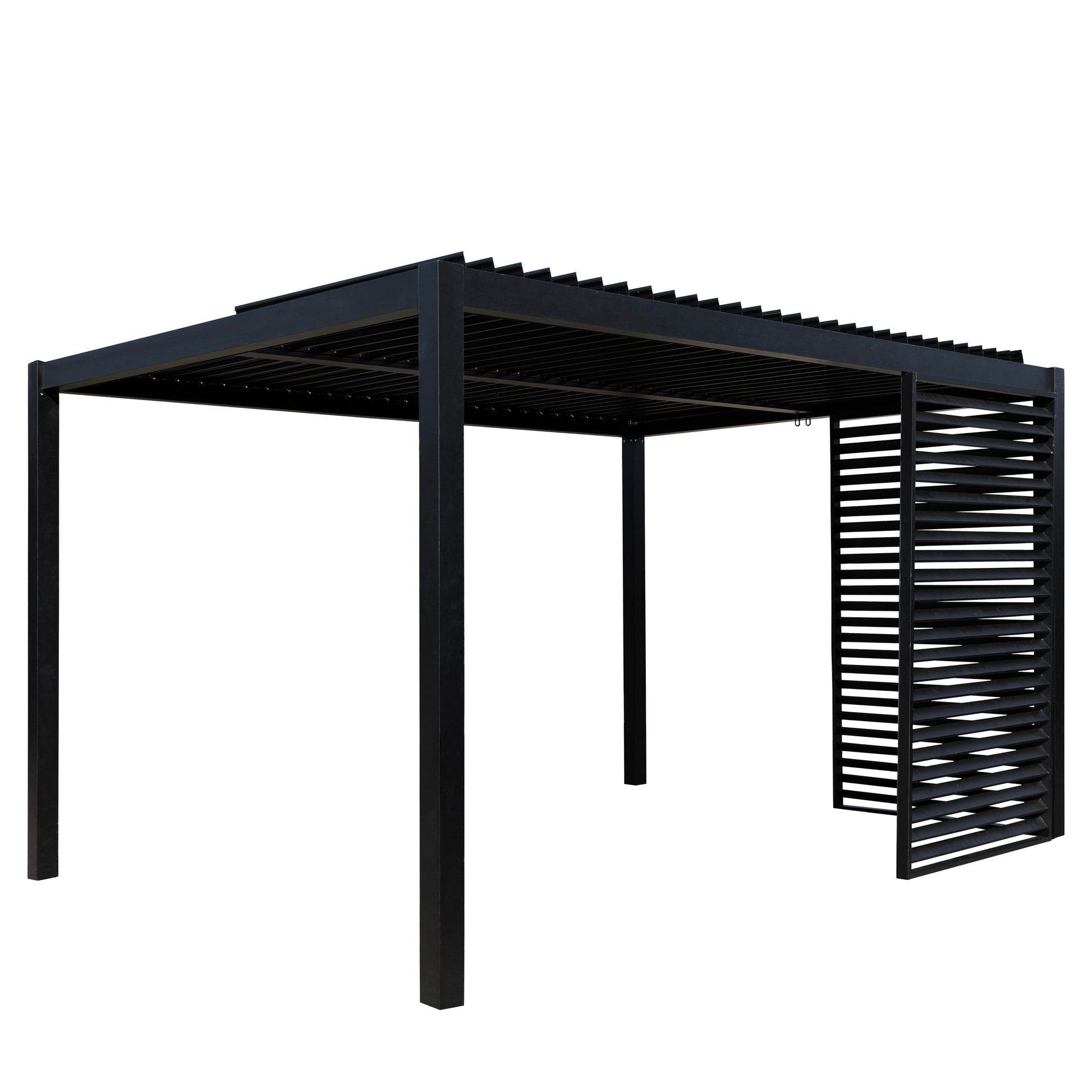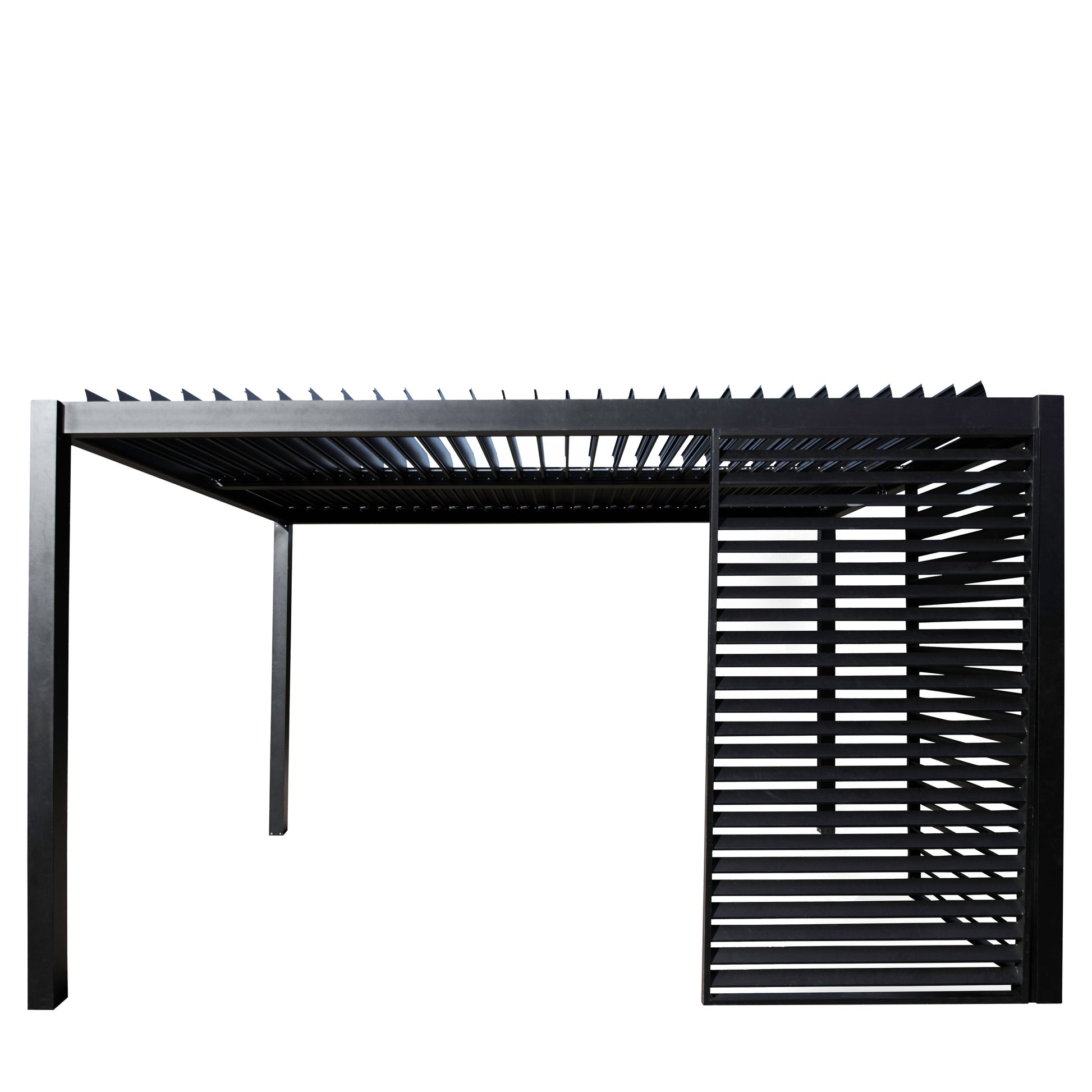 The Gallery Garden Messina Pergola in Black combines sophisticated design with practical functionality for year-round outdoor enjoyment. Its adjustable louvred roof system, operated via a convenient handle winder, grants you complete control over sunlight and weather protection. When closed, the overlapping louvres create a watertight seal whilst integrated drainage channels water efficiently down the frame's interior legs. Engineered for durability and refined style, this pergola transforms your garden into an extended living space.