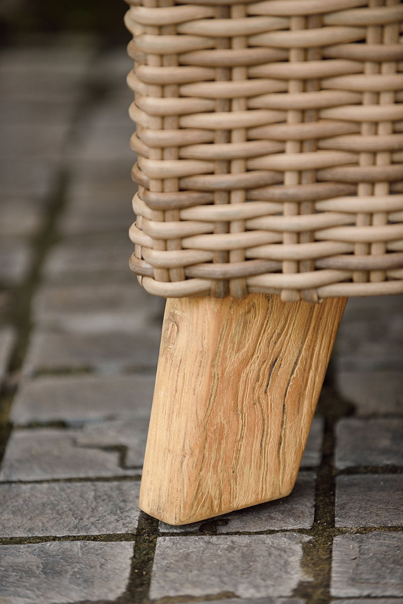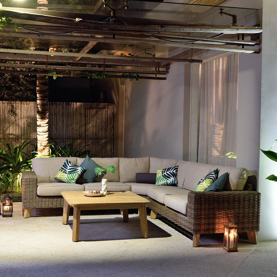 Discover the Bahamas Corner Coffee Set, a sophisticated outdoor solution crafted from premium all-weather wicker and reclaimed teak. Hand-woven with meticulous attention to detail, this signature collection features sumptuous body-hugging cushions upholstered in resilient olefin fabric. The earthy palette and warm teak tones create an inviting aesthetic perfect for expansive gardens and terraces. Built to withstand the elements whilst maintaining its refined appearance, this set combines durability with understated elegance, ideal for those seeking to establish a distinguished outdoor retreat for entertaining and relaxation throughout the seasons.