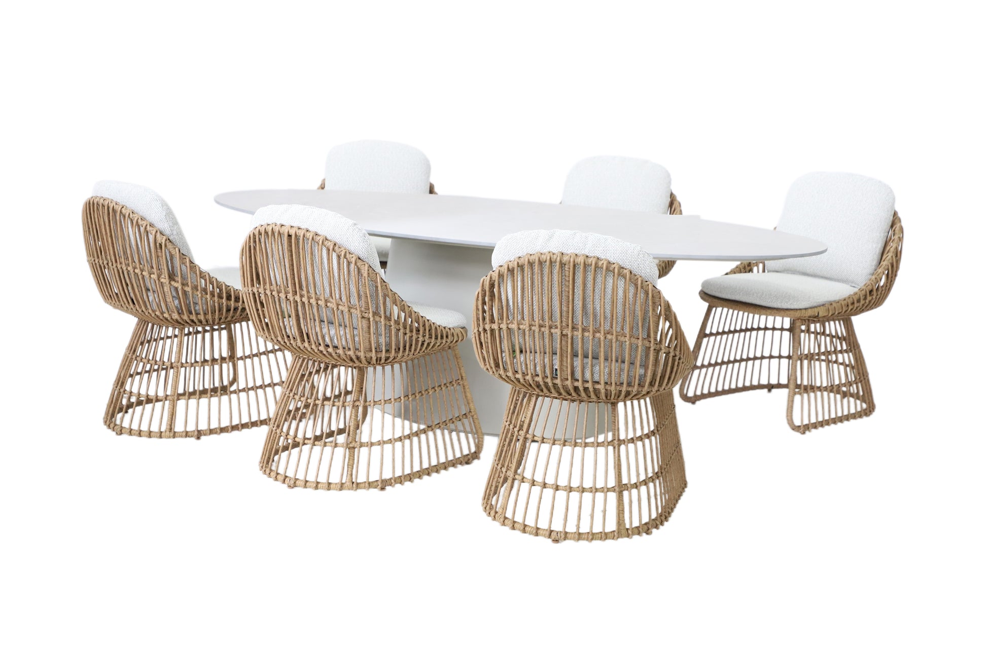 The Royal Garden Norden 6 Seat Dining Set brings contemporary Scandinavian design to your outdoor living space. With its distinctive woven rattan-effect chairs and sleek white table, this stunning dining set creates a sophisticated focal point for your garden, patio, or terrace.