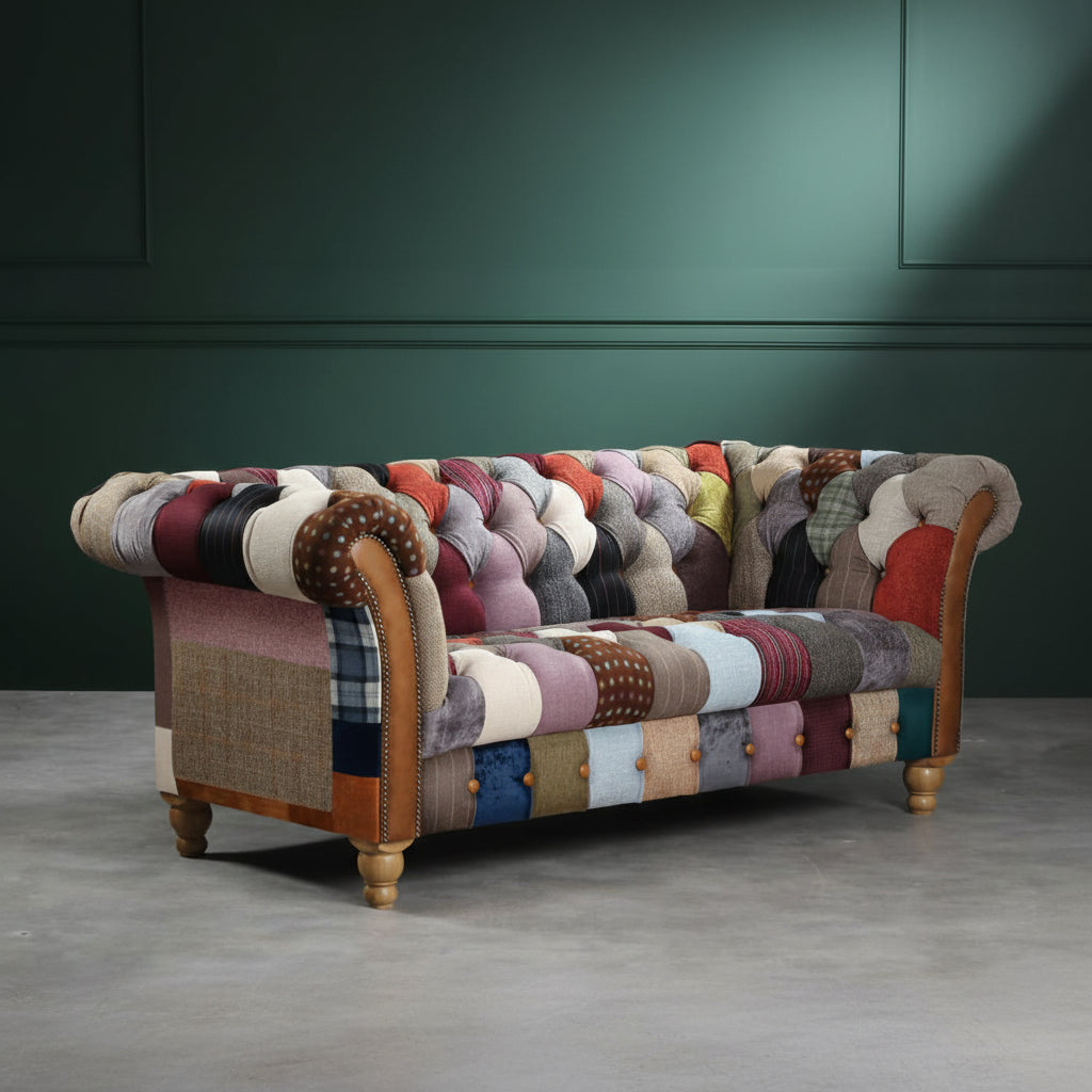 The Vintage Sofa Company Harlequin Patchwork 2 Seat Chesterfield Sofa with Patchwork Sides is an extraordinary piece that celebrates colour, texture, and exceptional British craftsmanship. This stunning sofa features vibrant patchwork covering every surface back, seat, arms, and sides creating a truly unique Chesterfield that's as much a work of art as it is a supremely comfortable place to relax.
